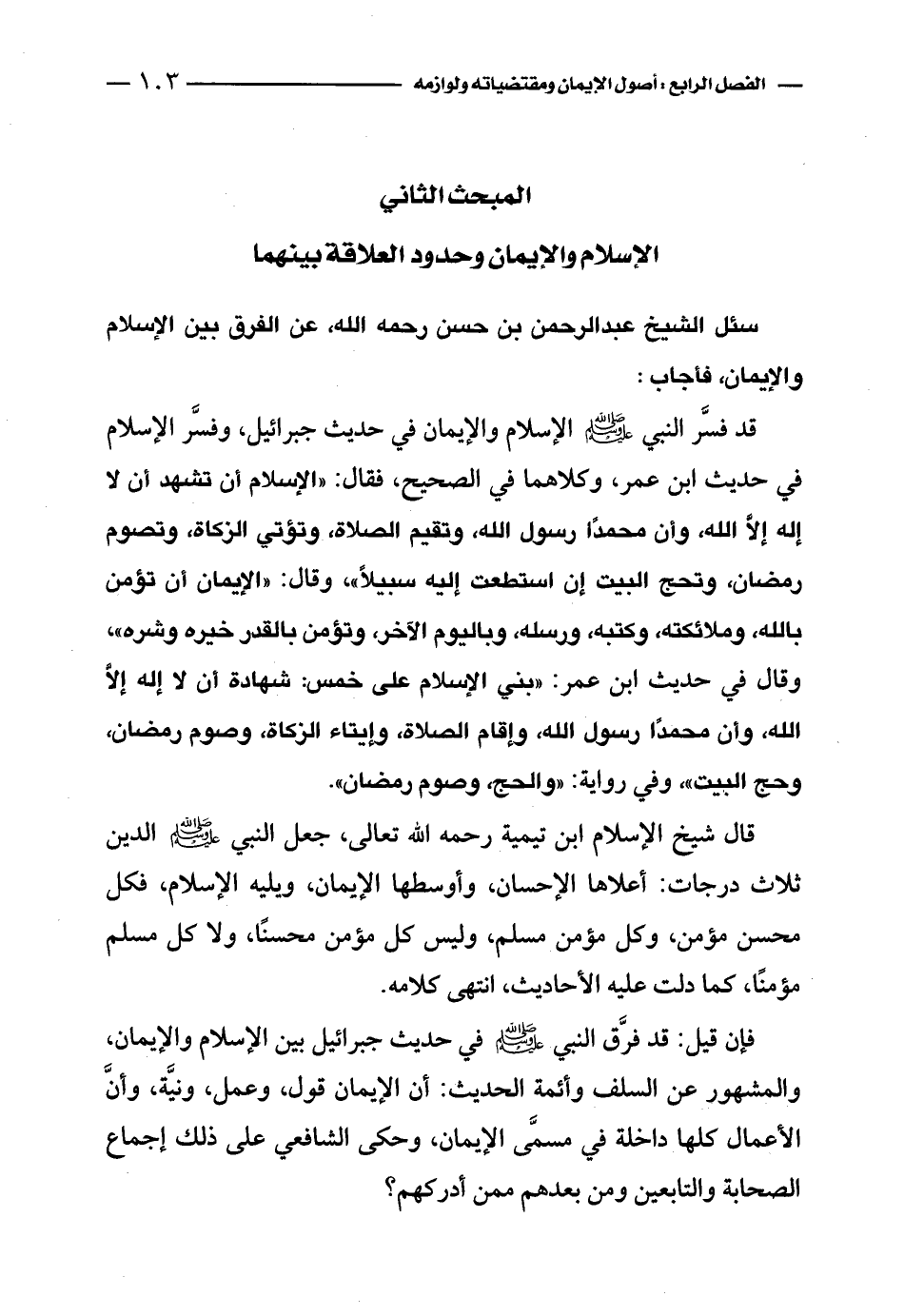 قد فسَّر النبي - صلى الله عليه وسلم - الإسلام والإيمان في حديث جبرائيل، وفسَّر الإسلام في حديث ابن عمر، وكلاهما في الصحيح، فقال: «الإسلام أن تشهد أن لا إله إلاَّ الله، وأن محمدًا رسول الله، وتقيم الصلاة، وتؤتي الزكاة، وتصوم رمضان، وتحج البيت إن استطعت إليه سبيلاً»، وقال: «الإيمان أن تؤمن بالله، وملائكته، وكتبه، ورسله، وباليوم الآخر، وتؤمن بالقدر خيره وشره»، وقال في حديث ابن عمر: «بني الإسلام على خمس: شهادة أن لا إله إلاَّ الله، وأن محمدًا رسول الله، وإقام الصلاة، وإيتاء الزكاة، وصوم رمضان، وحج البيت»، وفي رواية: «والحج، وصوم رمضان».
