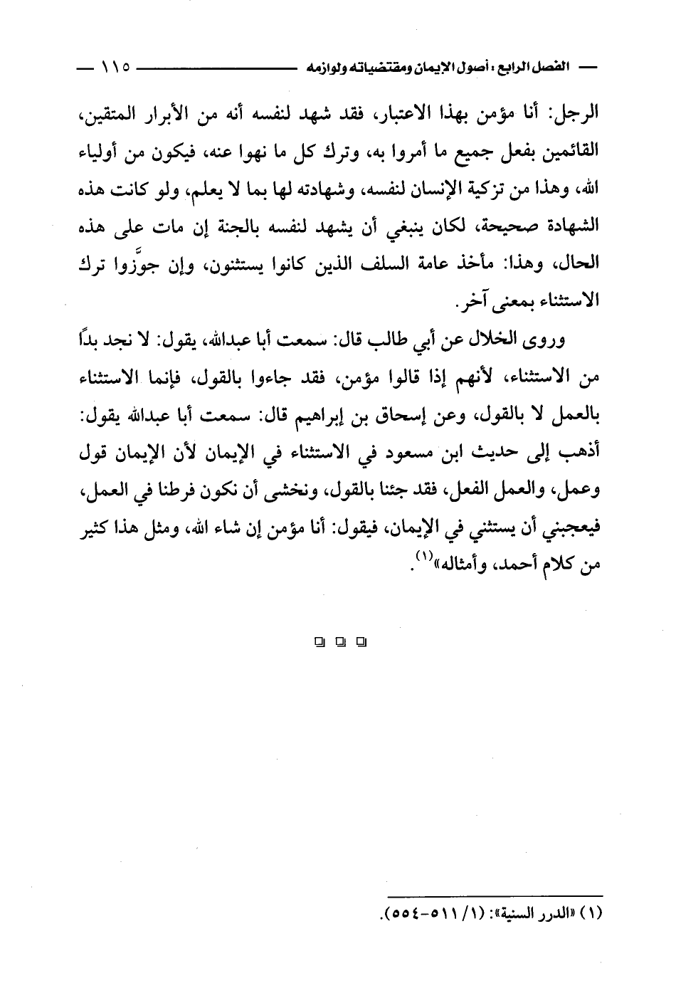 وروى الخلال عن أبي طالب قال: سمعت أبا عبد الله، يقول: لا نجد بدًا من الاستثناء، لأنهم إذا قالوا مؤمن، فقد جاءوا بالقول، فإنما الاستثناء بالعمل لا بالقول، وعن إسحاق بن إبراهيم قال: سمعت أبا عبد الله يقول: أذهب إلى حديث ابن مسعود في الاستثناء في الإيمان لأن الإيمان قول وعمل، والعمل الفعل، فقد جئنا بالقول، ونخشى أن نكون فرطنا في العمل، فيعجبني أن يستثني في الإيمان، فيقول: أنا مؤمن إن شاء الله، ومثل هذا كثير من كلام أحمد، وأمثاله» (¬1).