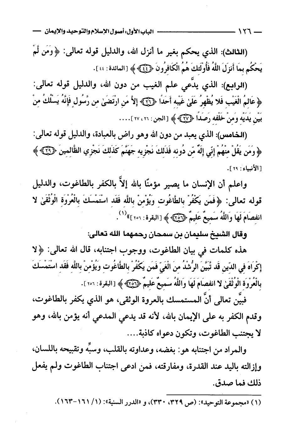 واعلم أن الإنسان ما يصير مؤمنًا بالله إلاَّ بالكفر بالطاغوت، والدليل قوله تعالى: {فَمَنْ يَكْفُرْ بِالطَّاغُوتِ وَيُؤْمِن بِاللهِ فَقَدِ اسْتَمْسَكَ بِالْعُرْوَةِ الْوُثْقَىَ لاَ انفِصَامَ لَهَا وَاللهُ سَمِيعٌ عَلِيمٌ} [البقرة: 256]» (¬1).