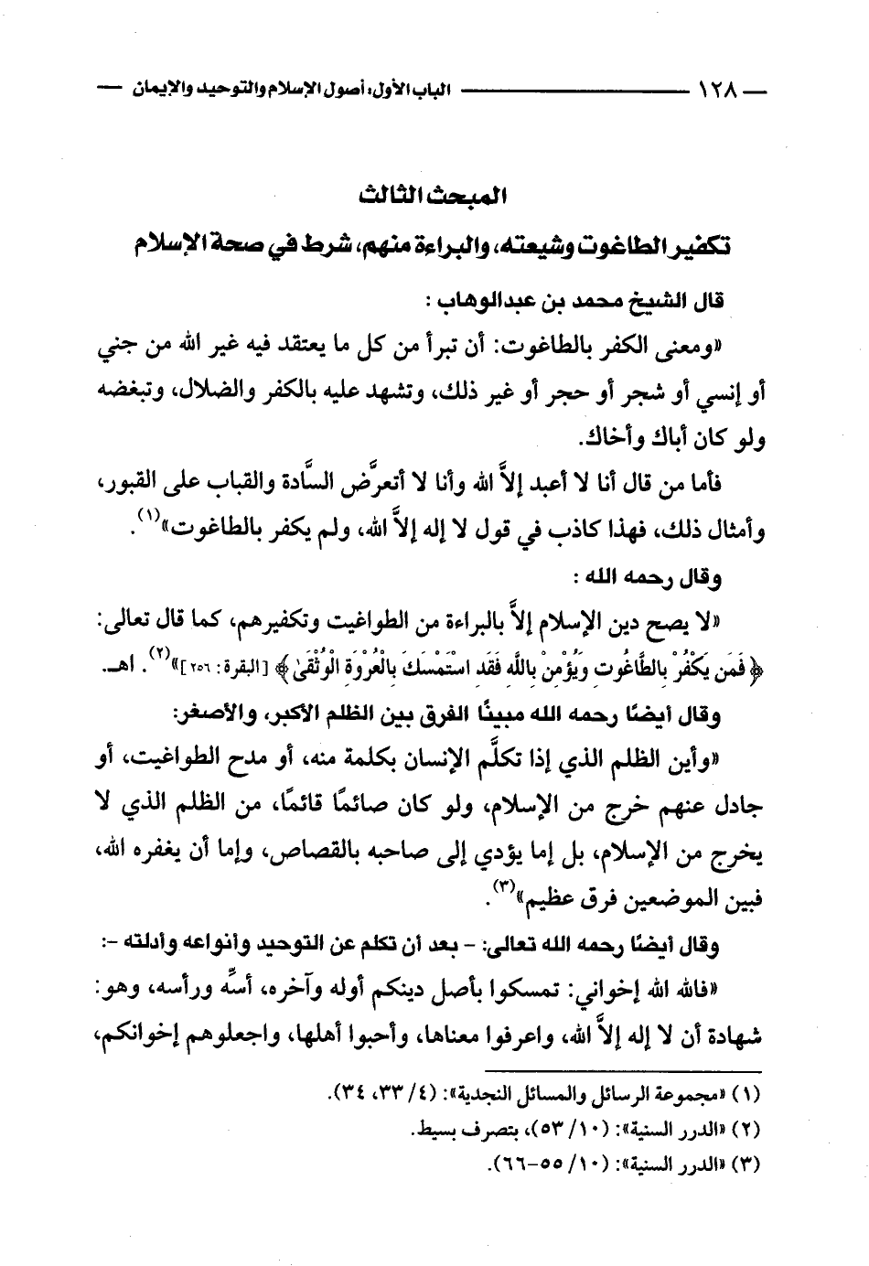 «لا يصح دين الإسلام إلاَّ بالبراءة من الطواغيت وتكفيرهم، كما قال تعالى: {فَمَنْ يَكْفُرْ بِالطَّاغُوتِ وَيُؤْمِن بِاللهِ فَقَدِ اسْتَمْسَكَ بِالْعُرْوَةِ الْوُثْقَىَ} [البقرة: 256]» (¬2). اهـ.