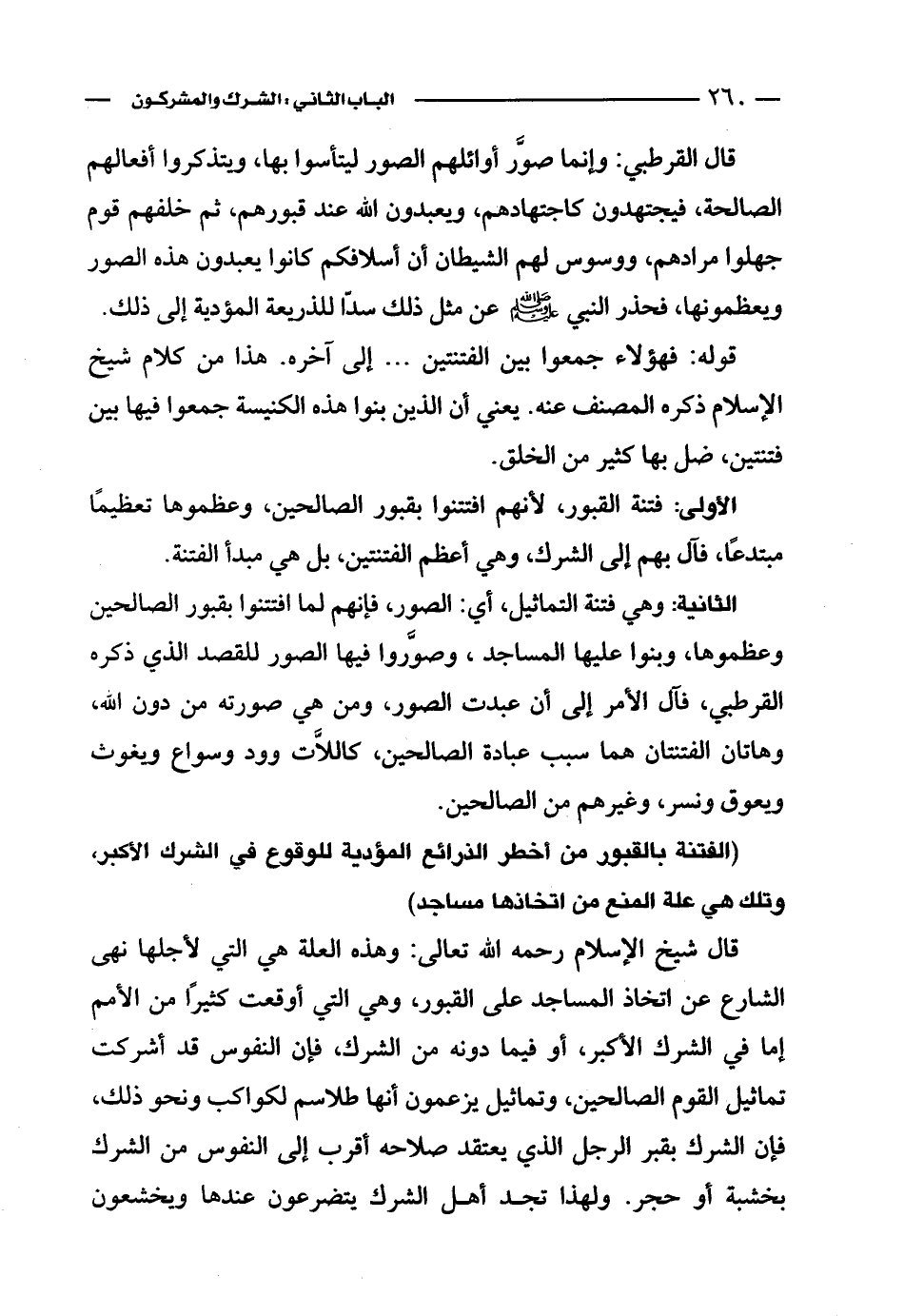 قال شيخ الإسلام رحمه الله تعالى: وهذه العلة هي التي لأجلها نهى الشارع عن اتخاذ المساجد على القبور، وهي التي أوقعت كثيرًا من الأمم إما في الشرك الأكبر، أو فيما دونه من الشرك، فإن النفوس قد أشركت تماثيل القوم الصالحين، وتماثيل يزعمون أنها طلاسم لكواكب ونحو ذلك، فإن الشرك بقبر الرجل الذي يعتقد صلاحه أقرب إلى النفوس من الشرك بخشبة أو حجر. ولهذا تجد أهل الشرك يتضرعون عندها ويخشعون