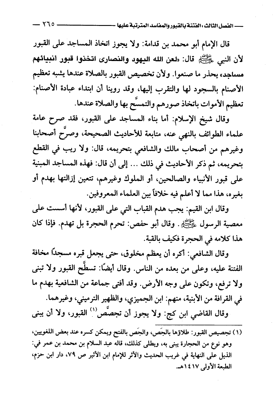 قال الإمام أبو محمد بن قدامة: ولا يجوز اتخاذ المساجد على القبور لأن النبي - صلى الله عليه وسلم - قال: «لعن الله اليهود والنصارى اتخذوا قبور أنبيائهم مساجد» يحذر ما صنعوا. ولأن تخصيص القبور بالصلاة عندها يشبه تعظيم الأصنام بالسجود لها والتقرب إليها، وقد روينا أن ابتداء عبادة الأصنام: تعظيم الأموات باتخاذ صورهم والتمسح بها والصلاة عندها.