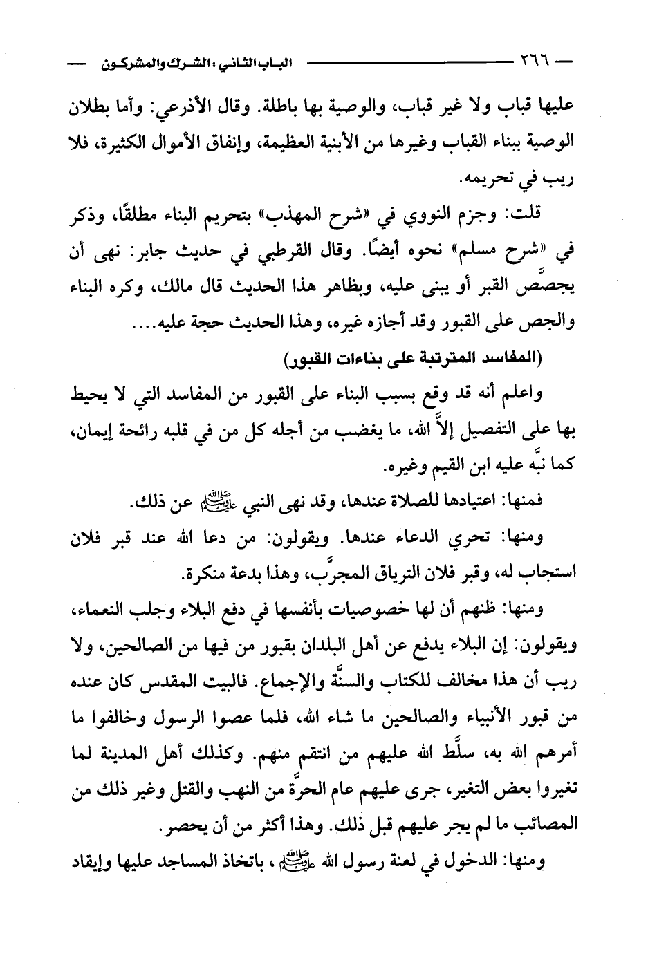 ومنها: ظنهم أن لها خصوصيات بأنفسها في دفع البلاء وجلب النعماء، ويقولون: إن البلاء يدفع عن أهل البلدان بقبور من فيها من الصالحين، ولا ريب أن هذا مخالف للكتاب والسنَّة والإجماع. فالبيت المقدس كان عنده من قبور الأنبياء والصالحين ما شاء الله، فلما عصوا الرسول وخالفوا ما أمرهم الله به، سلَّط الله عليهم من انتقم منهم. وكذلك أهل المدينة لما تغيروا بعض التغير، جرى عليهم عام الحرَّة من النهب والقتل وغير ذلك من المصائب ما لم يجر عليهم قبل ذلك. وهذا أكثر من أن يحصر.