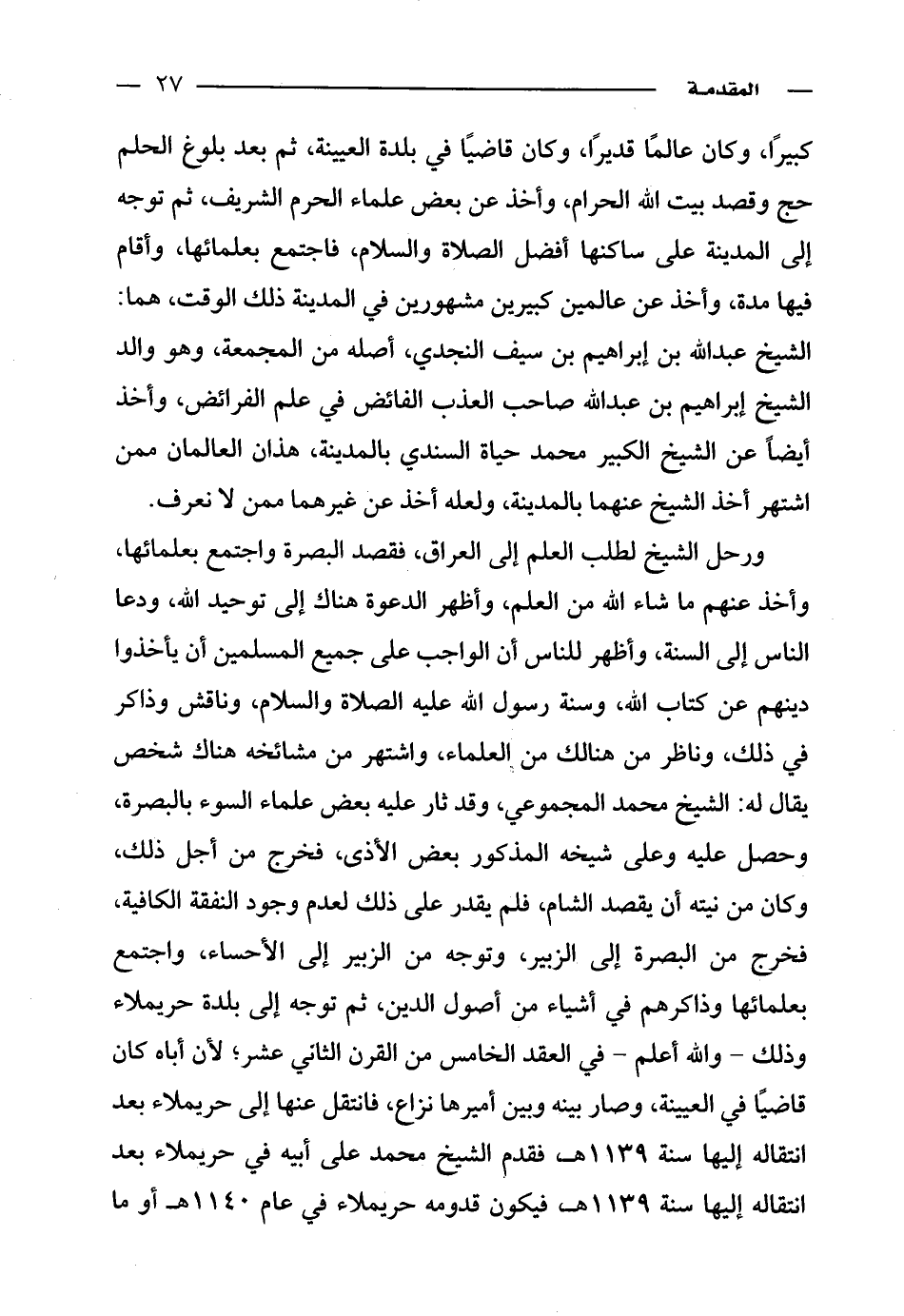 إليها سنة 1139 هـ، فيكون قدومه حريملاء في عام 1140 هـ أو ما