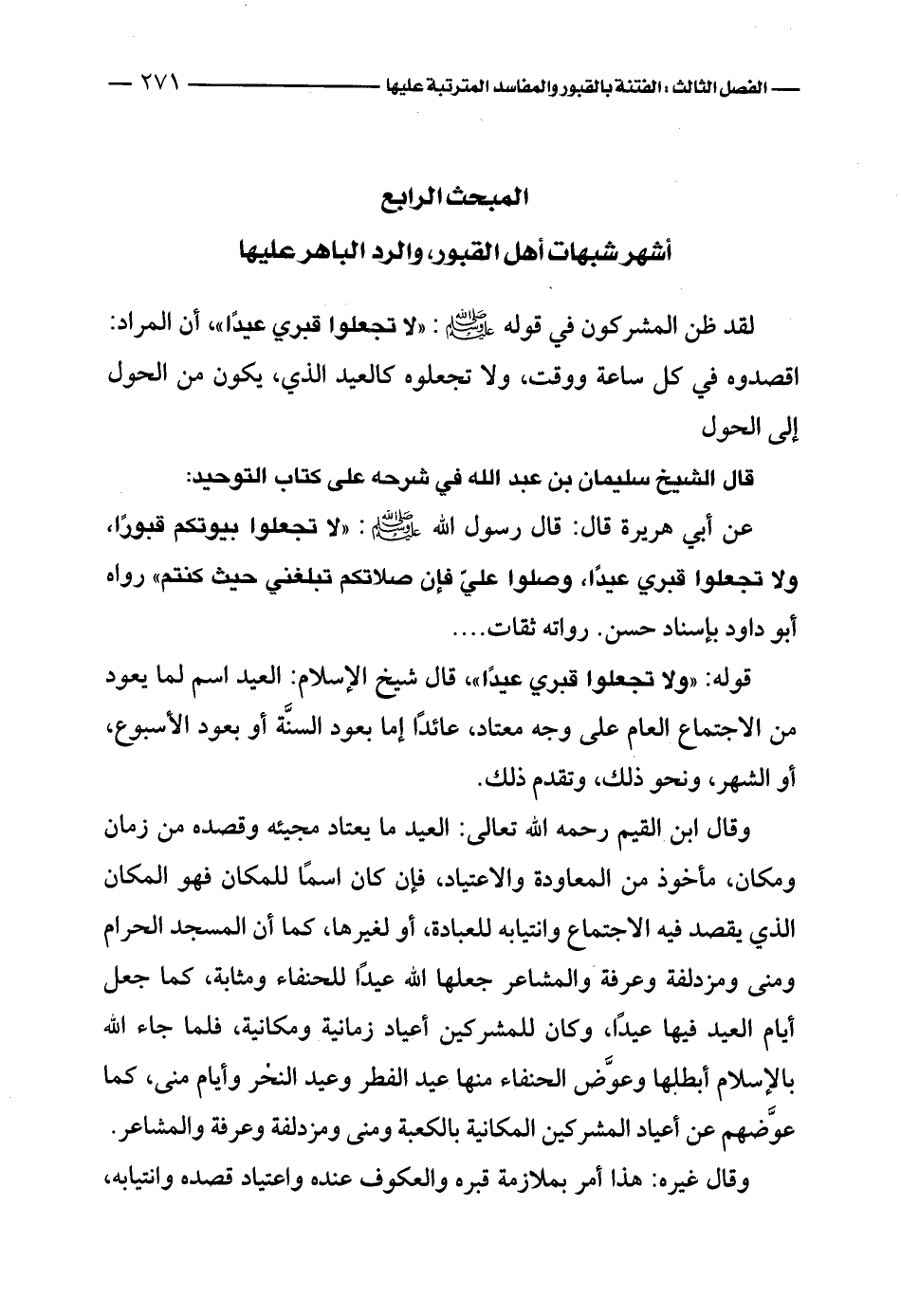لقد ظن المشركون في قوله - صلى الله عليه وسلم -: «لا تجعلوا قبري عيدًا»، أن المراد: اقصدوه في كل ساعة ووقت، ولا تجعلوه كالعيد الذي، يكون من الحول إلى الحول.