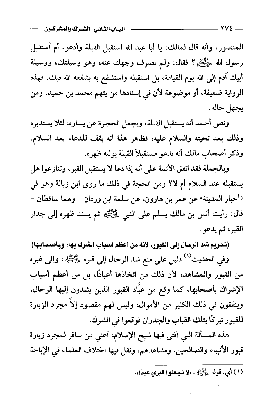 وفي الحديث (¬1) دليل على منع شد الرحال إلى قبره - صلى الله عليه وسلم -، وإلى غيره من القبور والمشاهد، لأن ذلك من اتخاذها أعيادًا، بل من أعظم أسباب الإشراك بأصحابها، كما وقع من عبَّاد القبور الذين يشدون إليها الرحال، وينفقون في ذلك الكثير من الأموال، وليس لهم مقصود إلاَّ مجرد الزيارة للقبور تبركًا بتلك القباب والجدران فوقعوا في الشرك.