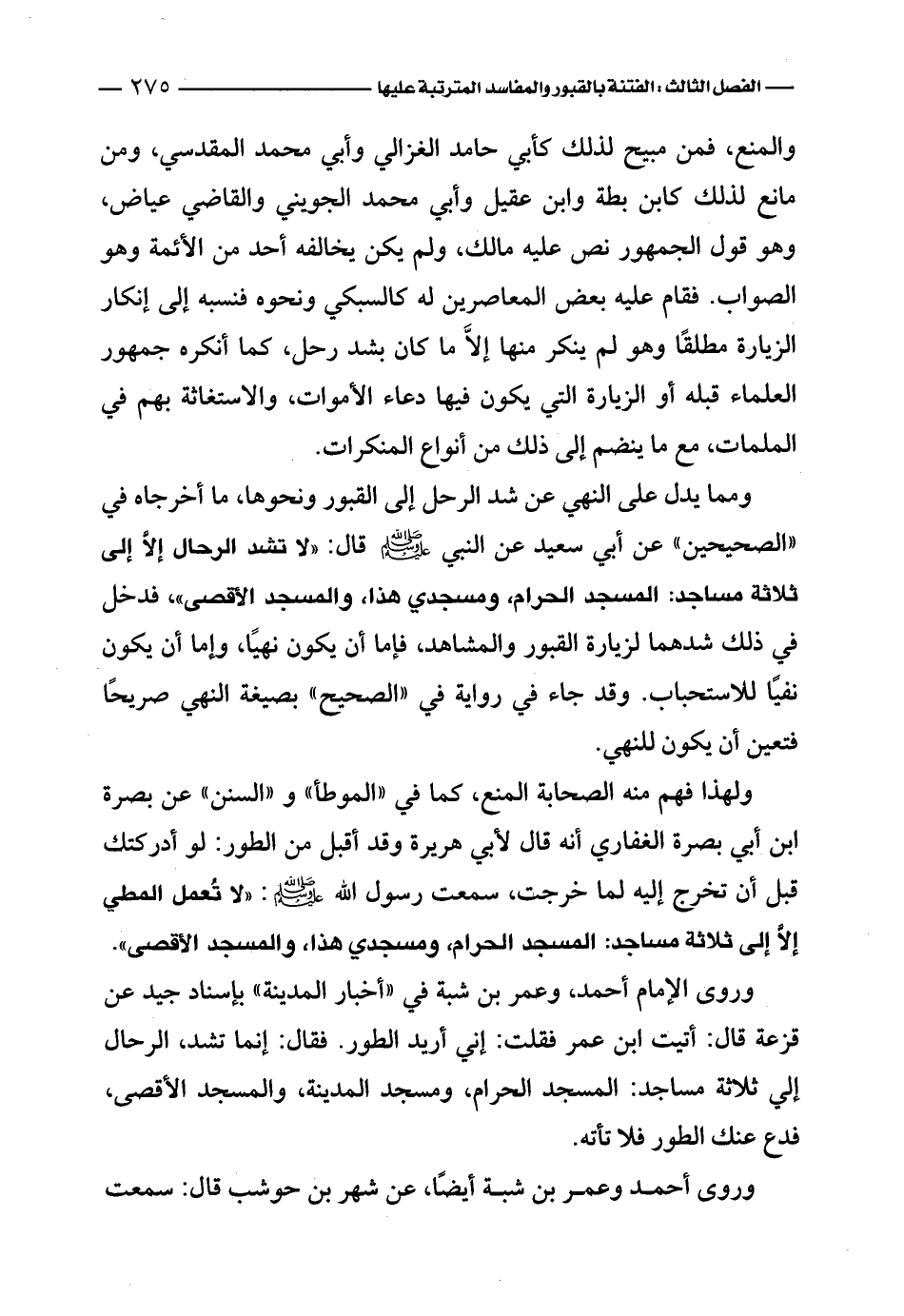 ومما يدل على النهي عن شد الرحل إلى القبور ونحوها، ما أخرجاه في «الصحيحين» عن أبي سعيد عن النبي - صلى الله عليه وسلم - قال: «لا تشد الرحال إلاَّ إلى ثلاثة مساجد: المسجد الحرام، ومسجدي هذا، والمسجد الأقصى»، فدخل في ذلك شدهما لزيارة القبور والمشاهد، فإما أن يكون نهيًا، وإما أن يكون نفيًا للاستحباب. وقد جاء في رواية في «الصحيح» بصيغة النهي صريحًا فتعين أن يكون للنهي.