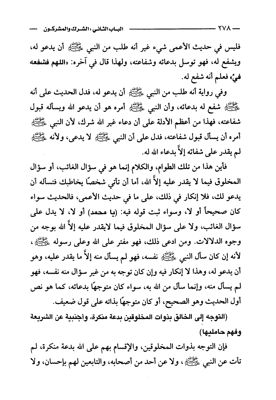 فأين هذا من تلك الطوام؟ والكلام إنما هو في سؤال الغائب، أو سؤال المخلوق فيما لا يقدر عليه إلاَّ الله، أما أن تأتي شخصًا يخاطبك فتسأله أن يدعو لك، فلا إنكار في ذلك، على ما في حديث الأعمى، فالحديث سواء كان صحيحًا أو لا، وسواء ثبت قوله فيه: (يا محمد) أو لا، لا يدل على سؤال الغائب، ولا على سؤال المخلوق، فيما لا يقدر عليه إلا الله بوجه من وجوه الدلالات. ومن ادعى ذلك، فهو مفتر على الله وعلى رسوله - صلى الله عليه وسلم -، لأنه إن كان سأل النبي - صلى الله عليه وسلم - نفسه، فهو لم يسأل منه إلاَّ ما يقدر عليه، وهو أن يدعو له، وهذا لا إنكار فيه وإن كان توجه به من غير سؤال منه نفسه، فهو لم يسأل منه، وإنما سأل من الله به، سواء كان متوجهًا بدعائه، كما هو نص أول الحديث وهو الصحيح، أو كان متوجهًا بذاته على قول ضعيف.