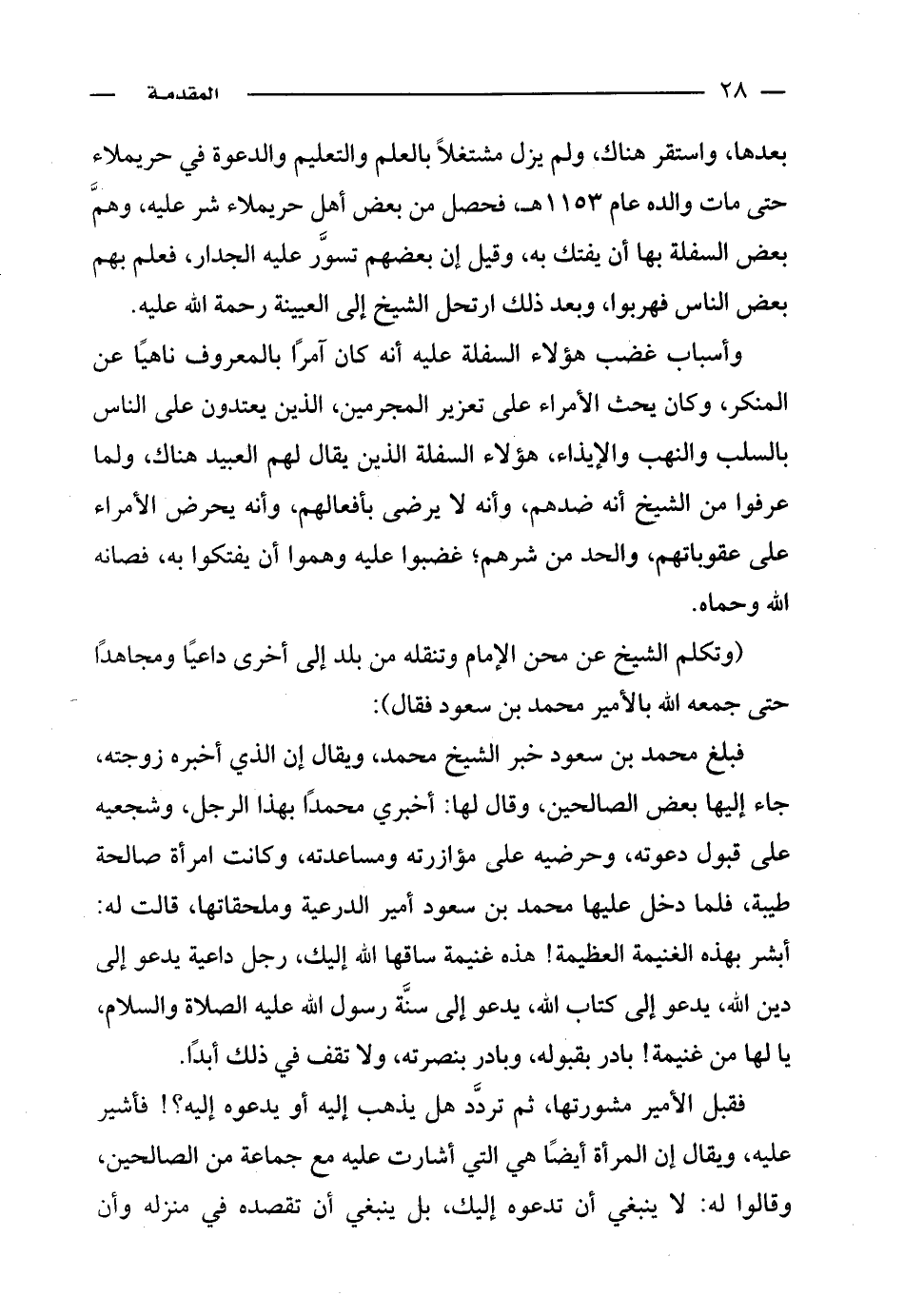 فبلغ محمد بن سعود خبر الشيخ محمد، ويقال إن الذي أخبره زوجته، جاء إليها بعض الصالحين، وقال لها: أخبري محمدًا بهذا الرجل، وشجعيه على قبول دعوته، وحرضيه على مؤازرته ومساعدته، وكانت امرأة صالحة طيبة، فلما دخل عليها محمد بن سعود أمير الدرعية وملحقاتها، قالت له: أبشر بهذه الغنيمة العظيمة! هذه غنيمة ساقها الله إليك، رجل داعية يدعو إلى دين الله، يدعو إلى كتاب الله، يدعو إلى سنَّة رسول الله - صلى الله عليه وسلم -، يا لها من غنيمة! بادر بقبوله، وبادر بنصرته، ولا تقف في ذلك أبدًا.