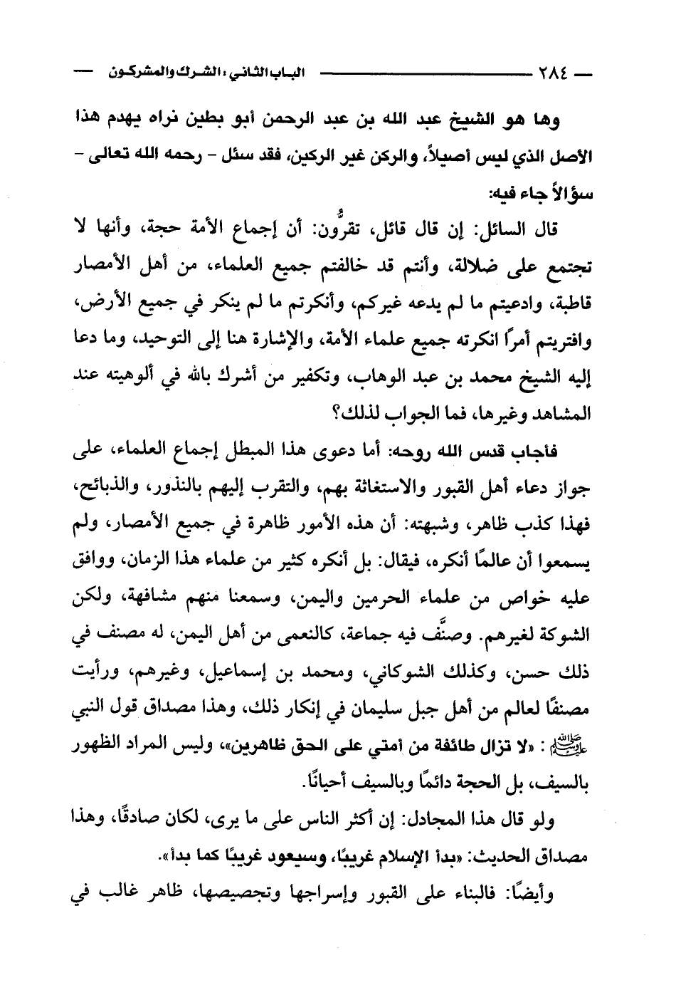 فأجاب قدس الله روحه: أما دعوى هذا المبطل إجماع العلماء، على جواز دعاء أهل القبور والاستغاثة بهم، والتقرب إليهم بالنذور، والذبائح، فهذا كذب ظاهر، وشبهته: أن هذه الأمور ظاهرة في جميع الأمصار، ولم يسمعوا أن عالمًا أنكره، فيقال بل: أنكره كثير من علماء هذا الزمان، ووافق عليه خواص من علماء الحرمين واليمن، وسمعنا منهم مشافهة، ولكن الشوكة لغيرهم. وصنَّف فيه جماعة. كالنعمي من أهل اليمن، له مصنف في ذلك حسن، وكذلك الشوكاني، ومحمد بن إسماعيل، وغيرهم، ورأيت مصنفًا لعالم من أهل جبل سليمان في إنكار ذلك، وهذا مصداق قول النبي - صلى الله عليه وسلم -: «لا تزال طائفة من أمتي على الحق ظاهرين»، وليس المراد الظهور بالسيف، بل الحجة دائمًا وبالسيف أحيانًا.