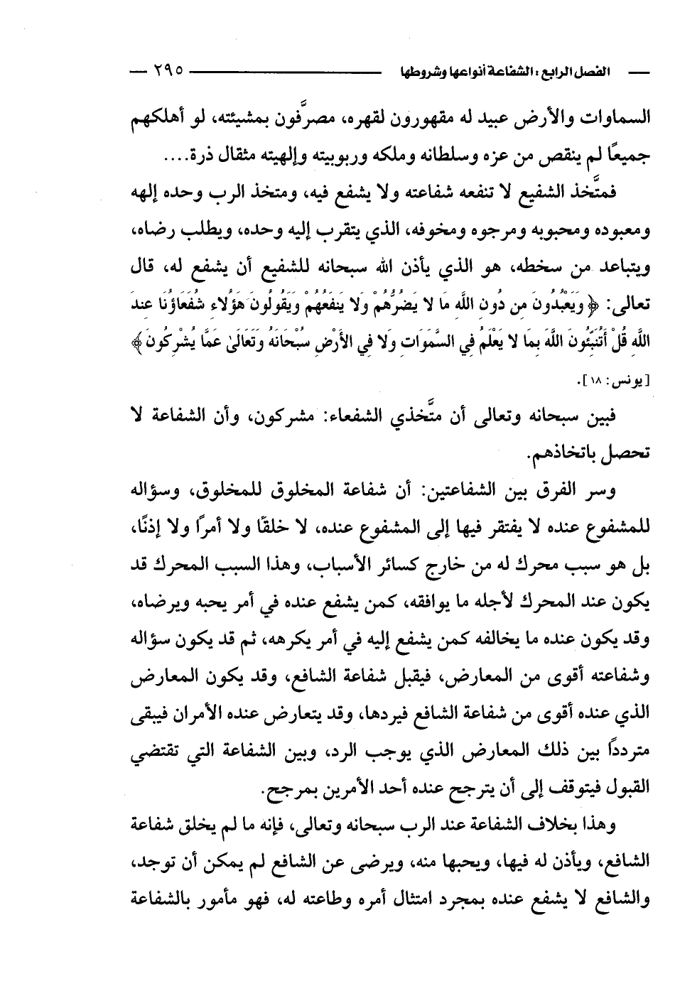 فمتَّخذ الشفيع لا تنفعه شفاعته ولا يشفع فيه، ومتخذ الرب وحده إلهه ومعبوده ومحبوبه ومرجوه ومخوفه، الذي يتقرب إليه وحده، ويطلب رضاه، ويتباعد من سخطه، هو الذي يأذن الله سبحانه للشفيع أن يشفع له، قال تعالى: {وَيَعْبُدُونَ مِن دُونِ اللهِ مَا لاَ يَضُرُّهُمْ وَلاَ يَنفَعُهُمْ وَيَقُولُونَ هَؤُلاء شُفَعَاؤُنَا عِندَ اللهِ قُلْ أَتُنَبِّئُونَ اللَّهَ بِمَا لاَ يَعْلَمُ فِي السَّمَاوَاتِ وَلاَ فِي الأَرْضِ سُبْحَانَهُ وَتَعَالَى عَمَّا يُشْرِكُونَ} [يونس: 18].