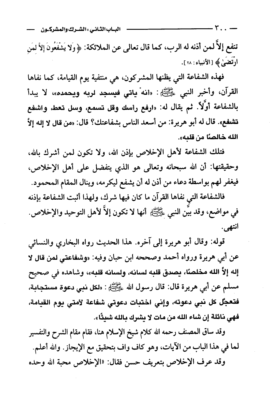 فهذه الشفاعة التي يظنها المشركون، هي منتفية يوم القيامة، كما نفاها القرآن، وأخبر النبي - صلى الله عليه وسلم -: «أنه يأتي فيسجد لربه ويحمده»، لا يبدأ بالشفاعة أوَّلاً. ثم يقال له: «ارفع رأسك وقل تسمع، وسل تعط، واشفع تشفع». قال له أبو هريرة: من أسعد الناس بشفاعتك؟ قال: «من قال لا إله إلاَّ الله خالصًا من قلبه».