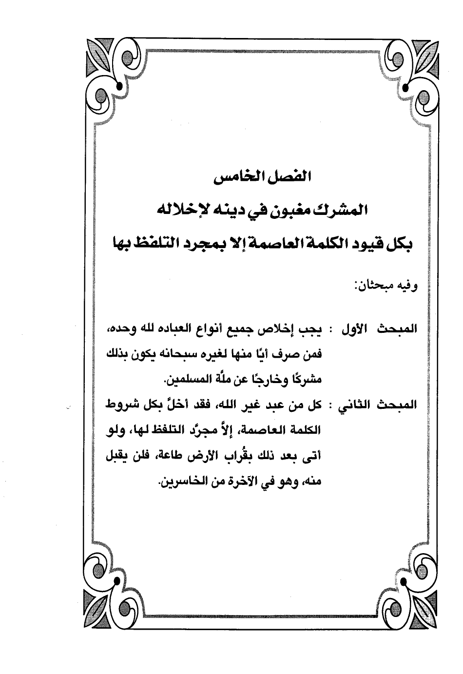 المبحث الثاني: كل من عبد غير الله، فقد أخلَّ بكل شروط الكلمة العاصمة، إلاَّ مجرَّد التلفظ لها، ولو أتى بعد ذلك بقُراب الأرض طاعة، فلن يقبل منه، وهو في الآخرة من الخاسرين.