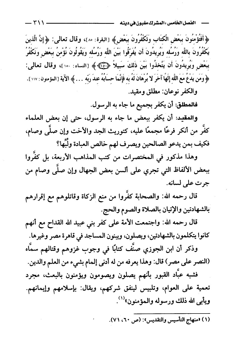 والمقيد: أن يكفر ببعض ما جاء به الرسول، حتى إن بعض العلماء كفَّر من أنكر فرعًا مجمعًا عليه، كتوريث الجد والأخت وإن صلَّى وصام، فكيف بمن يدعو الصالحين ويصرف لهم خالص العبادة ولُبَّها؟