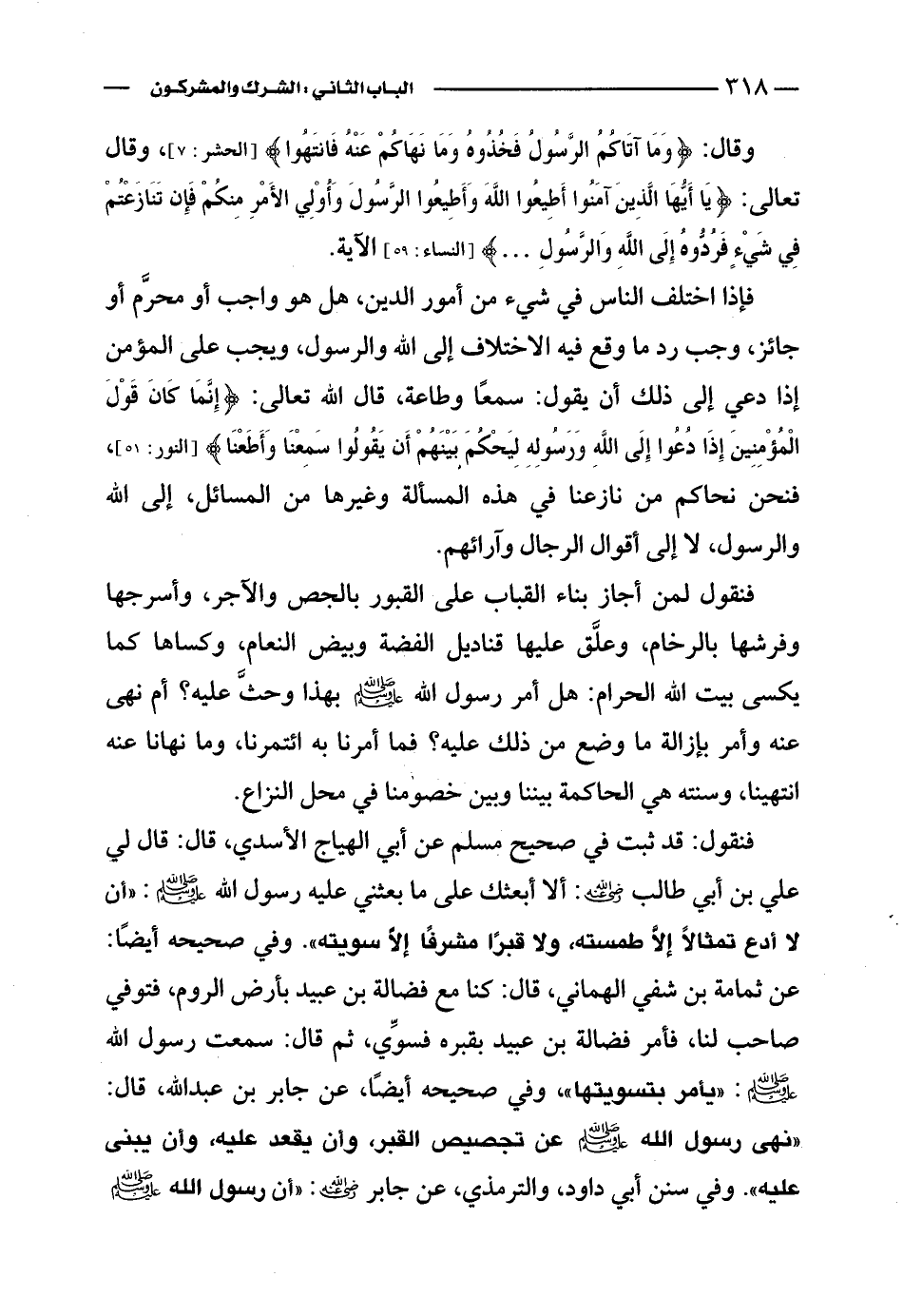 فنقول: قد ثبت في صحيح مسلم عن أبي الهياج الأسدي، قال: قال لي علي بن أبي طالب - رضي الله عنه -: ألا أبعثك على ما بعثني عليه رسول الله - صلى الله عليه وسلم -: «أن لا أدع تمثالاً إلاَّ طمسته، ولا قبرًا مشرفًا إلاَّ سويته». وفي صحيحه أيضًا: عن ثمامة بن شفي الهماني، قال: كنا مع فضالة بن عبيد بأرض الروم، فتوفي صاحب لنا، فأمر فضالة بن عبيد بقبره فسوِّي، ثم قال: سمعت رسول الله - صلى الله عليه وسلم -: «يأمر بتسويتها»، وفي صحيحه أيضًا، عن جابر بن عبد الله،