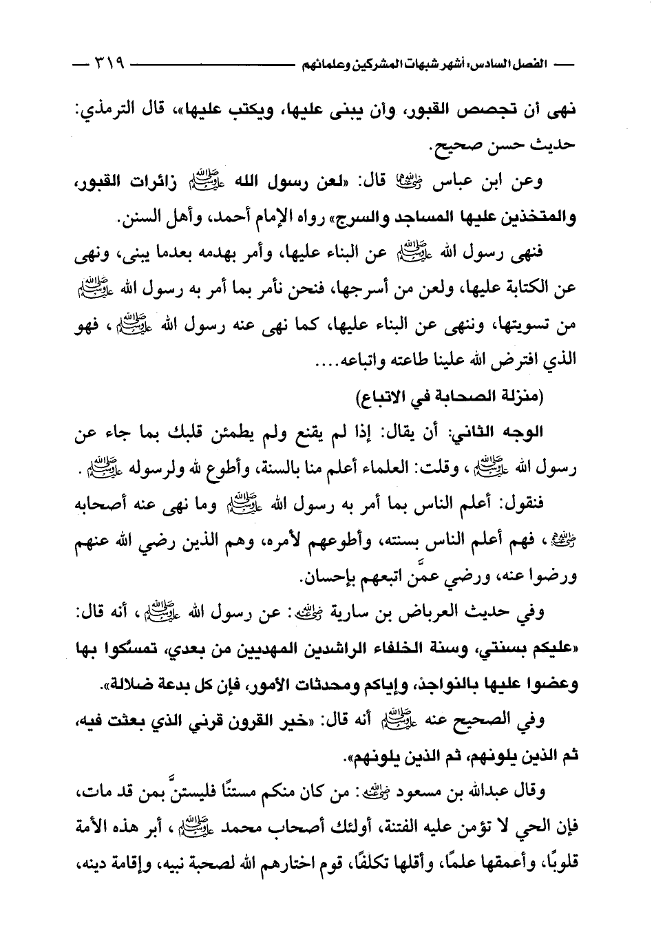 فنهى رسول الله - صلى الله عليه وسلم - عن البناء عليها، وأمر بهدمه بعدما يبنى، ونهى عن الكتابة عليها، ولعن من أسرجها، فنحن نأمر بما أمر به رسول الله - صلى الله عليه وسلم - من تسويتها، وننهى عن البناء عليها، كما نهى عنه رسول الله - صلى الله عليه وسلم -، فهو الذي افترض الله علينا طاعته واتباعه ....