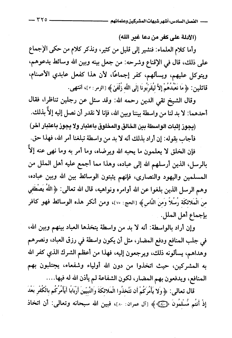 وأما كلام العلماء: فنشير إلي قليل من كثير، ونذكر كلام من حكى الإجماع على ذلك، قال في الإقناع وشرحه: من جعل بينه وبين الله وسائط يدعوهم، ويتوكل عليهم، ويسألهم، كفر إجماعًا، لأن هذا كفعل عابدي الأصنام، قائلين: {مَا نَعْبُدُهُمْ إِلَّا لِيُقَرِّبُونَا إِلَى اللَّهِ زُلْفَى} [الزمر: 3]. انتهى.