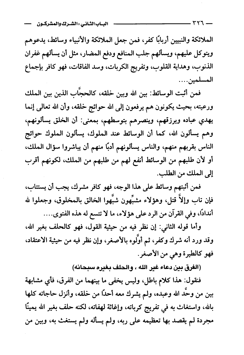 فنقول: هذا كلام باطل، وليس يخفى ما بينهما من الفرق، فأي مشابهة بين من وحَّد الله وعبده، ولم يشرك معه أحدًا من خلقه، وأنزل حاجاته كلها بالله، واستغاث به في تفريج كرباته، وإغاثة لهفاته، لكنه حلف بغير الله يمينًا مجردة لم يقصد بها تعظيمه على ربه، ولم يسأله ولم يستغث به، وبين من