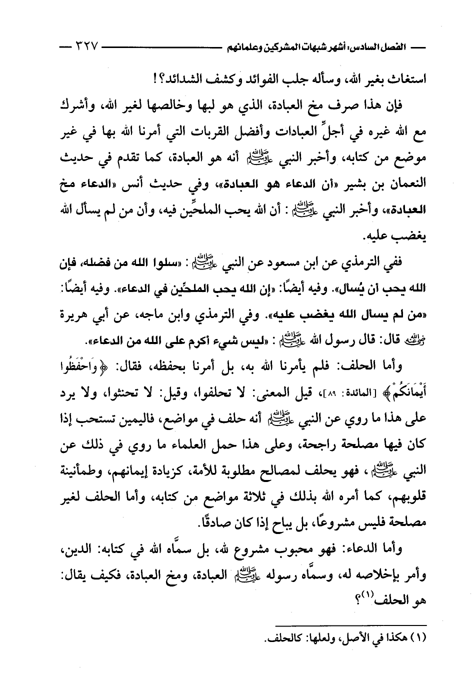 وأما الدعاء: فهو محبوب مشروع لله، بل سمَّاه الله في كتابه: الدين، وأمر بإخلاصه له، وسمَّاه رسوله - صلى الله عليه وسلم - العبادة، ومخ العبادة، فكيف يقال: هو الحلف (¬1)؟