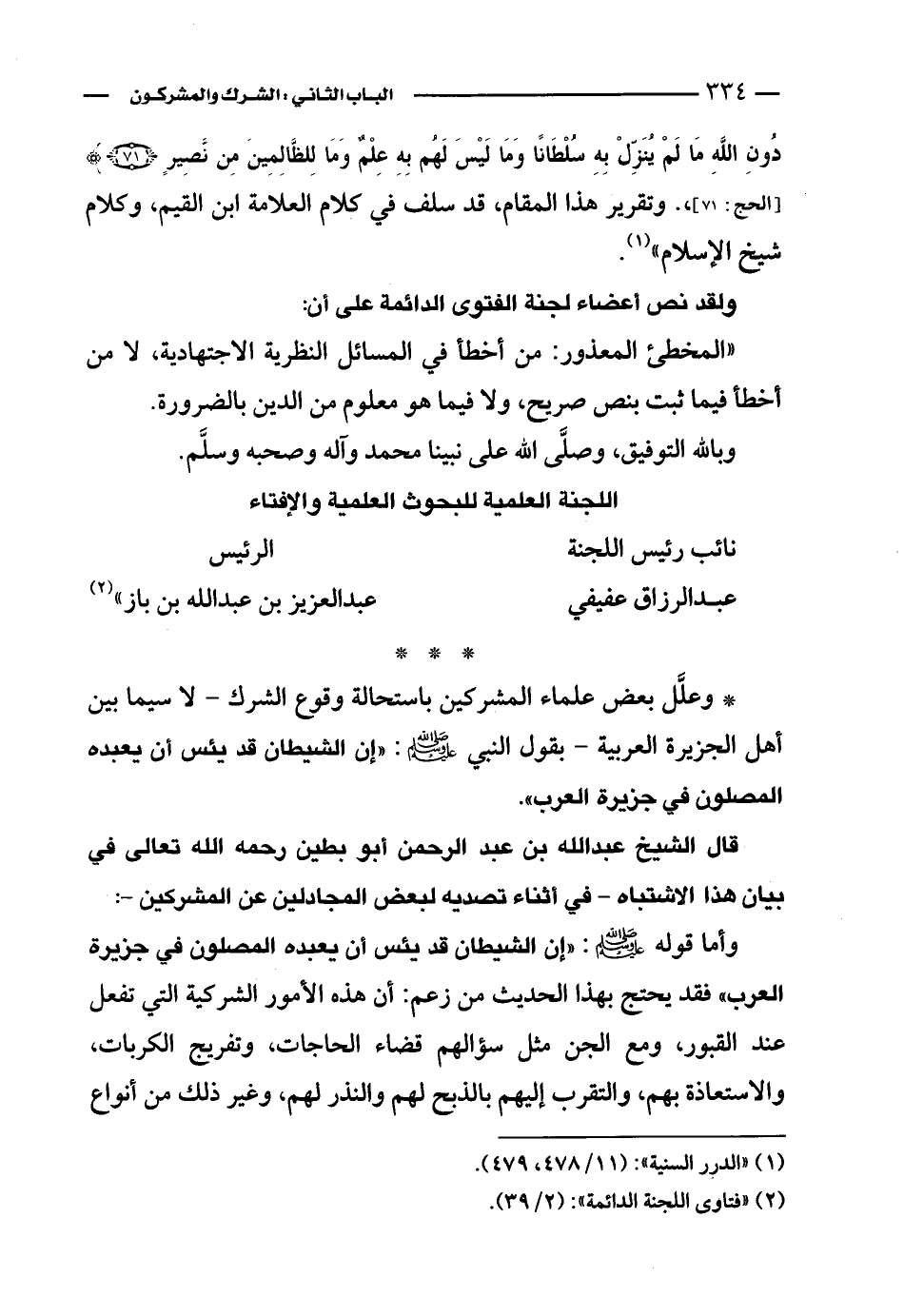 * وعلَّل بعض علماء المشركين باستحالة وقوع الشرك - لا سيما بين أهل الجزيرة العربية - بقول النبي - صلى الله عليه وسلم -: «إن الشيطان قد يئس أن يعبده المصلون في جزيرة العرب».
