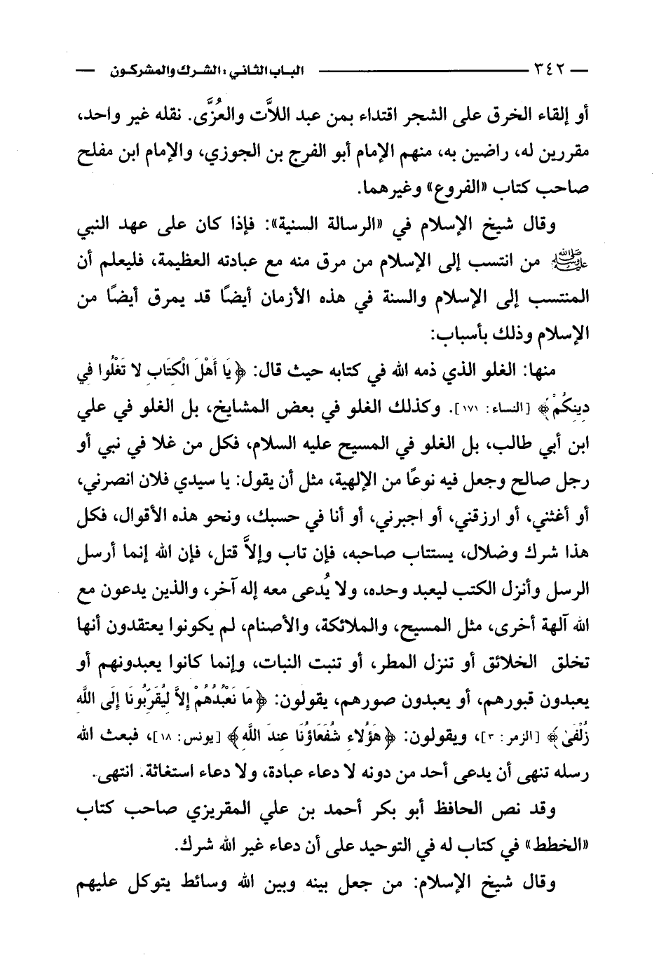 منها: الغلو الذي ذمه الله في كتابه حيث قال: {يَا أَهْلَ الْكِتَابِ لاَ تَغْلُواْ فِي دِينِكُمْ} [النساء: 171]. وكذلك الغلو في بعض المشايخ، بل الغلو في علي بن أبي طالب، بل الغلو في المسيح - عليه السلام -، فكل من غلا في نبي أو رجل صالح وجعل فيه نوعًا من الإلهية، مثل أن يقول: يا سيدي فلان انصرني، أو أغثني، أو ارزقني، أو اجبرني، أو أنا في حسبك، ونحو هذه الأقوال، فكل هذا شرك وضلال، يستتاب صاحبه، فإن تاب وإلاَّ قتل، فإن الله إنما أرسل الرسل وأنزل الكتب ليعبد وحده، ولا يُدعى معه إله آخر، والذين يدعون مع الله آلهة أخرى، مثل المسيح، والملائكة، والأصنام، لم يكونوا يعتقدون أنها تخلق الخلائق أو تنزل المطر، أو تنبت النبات، وإنما كانوا يعبدونهم أو يعبدون قبورهم، أو يعبدون صورهم، يقولون: {مَا نَعْبُدُهُمْ إِلَّا لِيُقَرِّبُونَا إِلَى اللَّهِ زُلْفَى} [الزمر: 3]، ويقولون: {هَؤُلاء شُفَعَاؤُنَا عِندَ اللهِ} [يونس: 18]، فبعث الله رسله تنهى أن يدعى أحد من دونه لا دعاء عبادة، ولا دعاء استغاثة. انتهى.