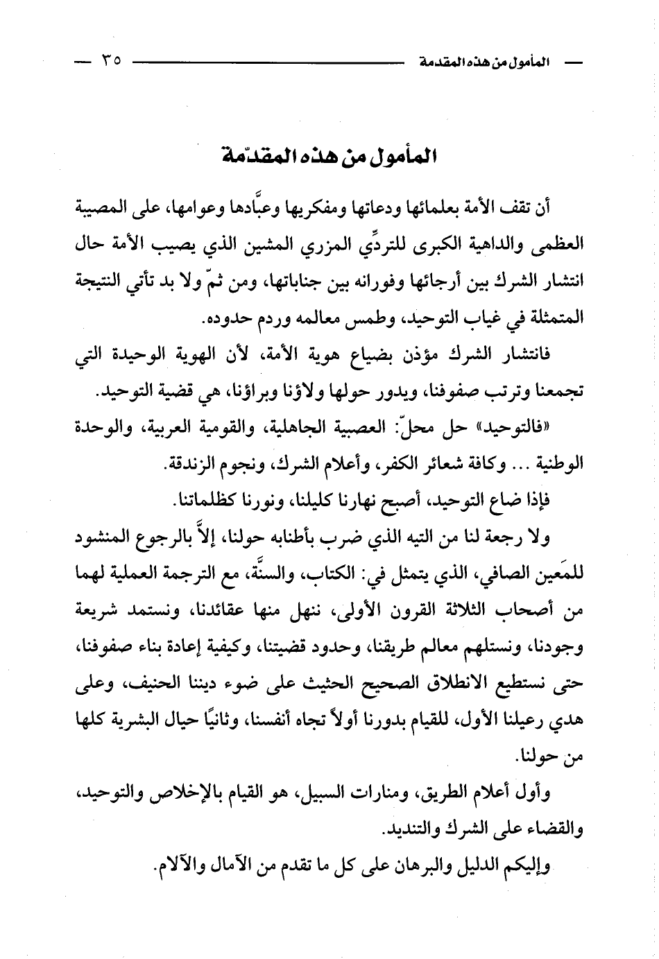 أن تقف الأمة بعلمائها ودعاتها ومفكريها وعبَّادها وعوامها، على المصيبة العظمى والداهية الكبرى للتردِّي المزري المشين الذي يصيب الأمة حال انتشار الشرك بين أرجائها وفورانه بين جنباتها ومن ثم ولا بد تأتي النتيجة المتمثلة في غياب التوحيد، وطمس معالمه وردم حدوده.