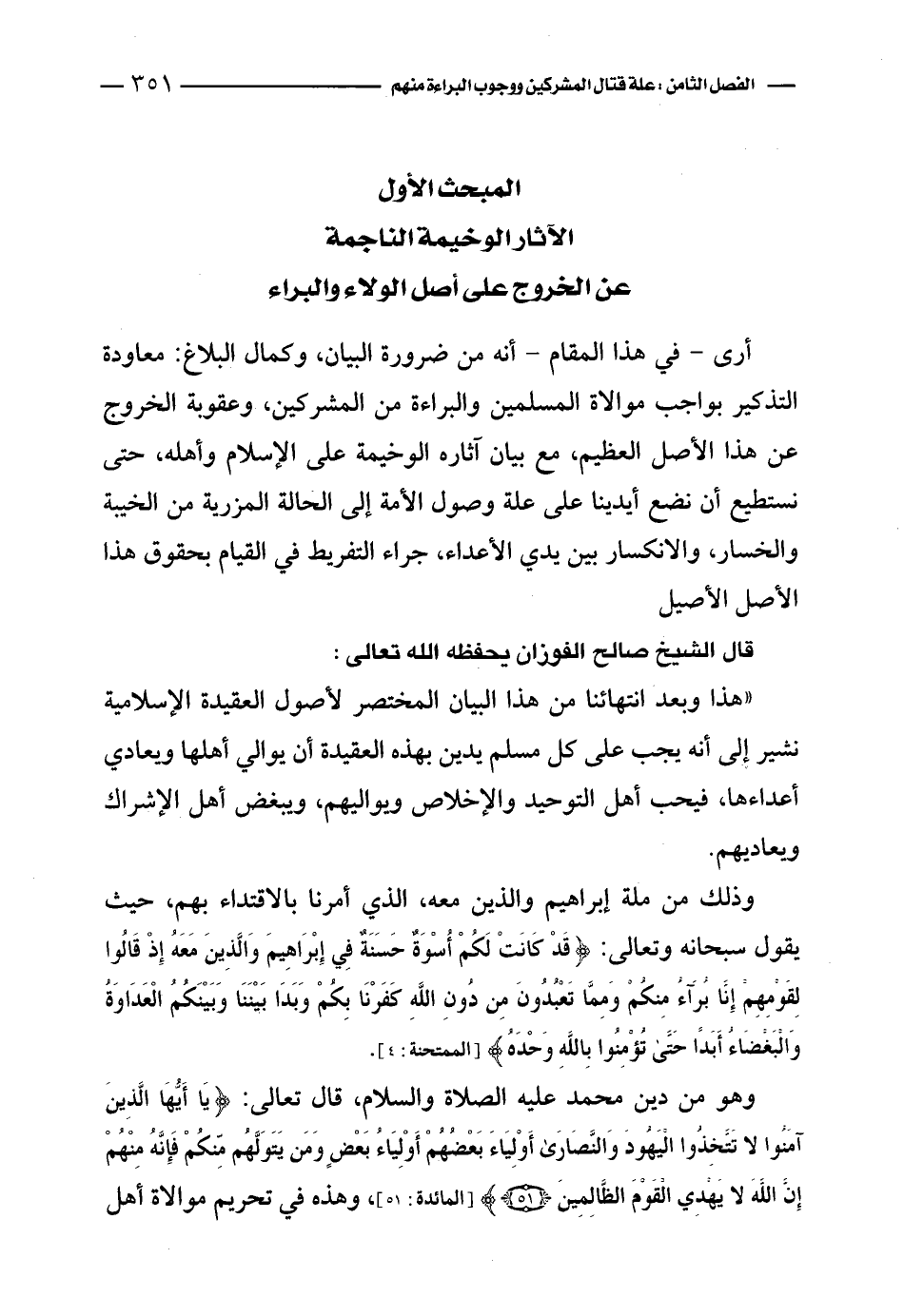«وهذا وبعد انتهائنا من هذا البيان المختصر لأصول العقيدة الإسلامية نشير إلى أنه يجب على كل مسلم يدين بهذه العقيدة أن يوالي أهلها ويعادي أعداءها، فيحب أهل التوحيد والإخلاص ويواليهم، ويبغض أهل الإشراك ويعاديهم.