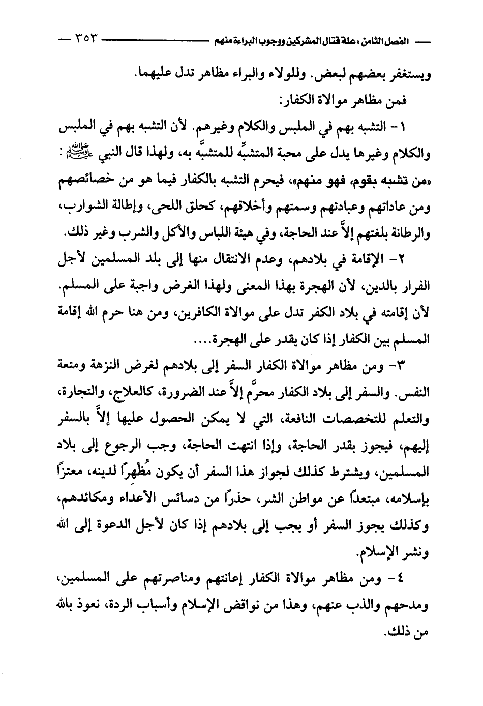 1 - التشبه بهم في الملبس والكلام وغيرهما؛ لأن التشبه بهم في الملبس والكلام وغيرهما يدل على محبة المتشبِّه للمتشبَّه به، ولهذا قال النبي - صلى الله عليه وسلم -: «من تشبه بقوم، فهو منهم»، فيحرم التشبه بالكفار فيما هو من خصائصهم ومن عاداتهم وعبادتهم وسمتهم وأخلاقهم، كحلق اللحى، وإطالة الشوارب، والرطانة بلغتهم إلاَّ عند الحاجة، وفي هيئة اللباس والأكل والشرب وغير ذلك.