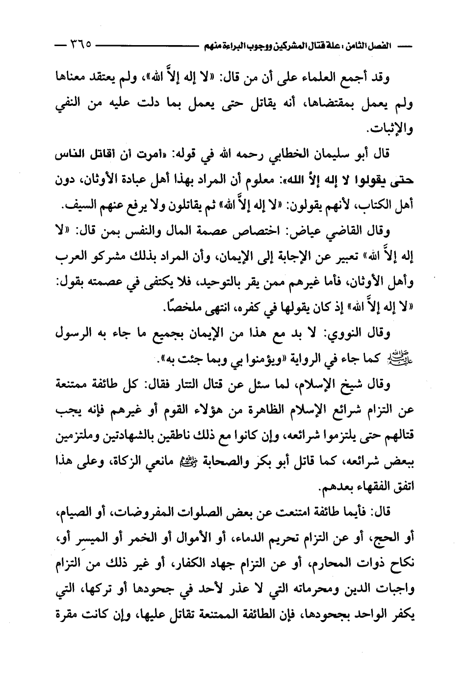 وقال شيخ الإسلام، لما سئل عن قتال التتار فقال: كل طائفة ممتنعة عن التزام شرائع الإسلام الظاهرة من هؤلاء القوم أو غيرهم فإنه يجب قتالهم حتى يلتزموا شرائعه، وإن كانوا مع ذلك ناطقين بالشهادتين وملتزمين ببعض شرائعه، كما قاتل أبو بكر والصحابة - رضي الله عنه - مانعي الزكاة، وعلى هذا اتفق الفقهاء بعدهم.