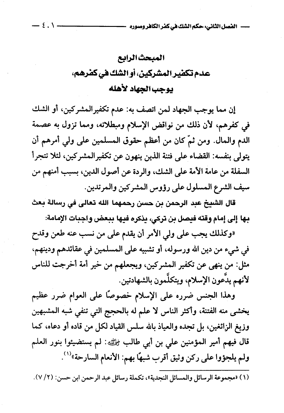 عدم تكفير المشركين، أو الشك في كفرهم، يوجب الجهاد لأهله
