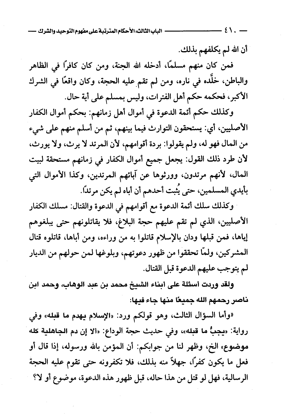«وأما السؤال الثالث، وهو قولكم ورد: «الإسلام يهدم ما قبله» وفي رواية: «يجبُّ ما قبله»، وفي حديث حجة الوداع: «ألا إن دم الجاهلية كله موضوع» إلخ، وظهر لنا من جوابكم: أن المؤمن بالله ورسوله، إذا قال أو فعل ما يكون كفرًا، جهلاً منه بذلك، فلا تكفرونه حتى تقوم عليه الحجة