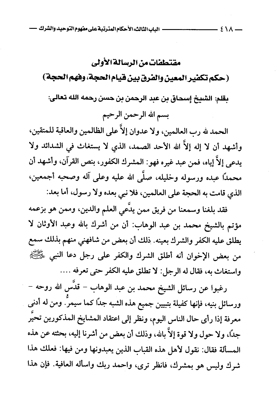 فقد بلغنا وسمعنا من فريق ممن يدَّعي العلم والدين، وممن هو بزعمه مؤتم بالشيخ محمد بن عبد الوهاب: أن من أشرك بالله وعبد الأوثان لا يطلق عليه الكفر والشرك بعينه. ذلك أن بعض من شافهني منهم بذلك سمع من بعض الإخوان أنه أطلق الشرك والكفر على رجل دعا النبي - صلى الله عليه وسلم - واستغاث به، فقال له الرجل: لا تطلق عليه الكفر حتى تعرفه ...