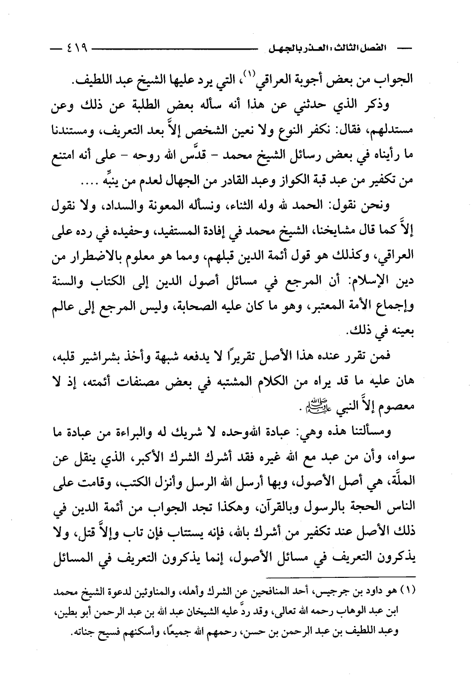 (¬1) هو داود بن جرجيس، أحد المنافحين عن الشرك وأهله، والمناوئين لدعوة الشيخ محمد بن عبد الوهاب رحمه الله تعالى، وقد ردَّ عليه الشيخان عبد الله بن عبد الرحمن أبو بطين، وعبد اللطيف بن عبد الرحمن بن حسن، رحمهم الله جميعًا، وأسكنهم فسيح جناته.