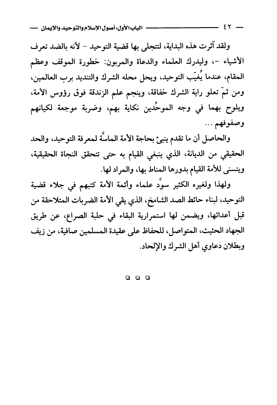 والحاصل أن ما تقدم ينبئ بحاجة الأمة الماسَّة لمعرفة التوحيد، والحد الحقيقي من الديانة، الذي ينبغي القيام به حتى تتحقق النجاة الحقيقية ويتسنى للأمة القيام بدورها المناط بها، والمراد لها.