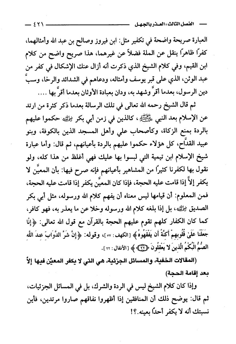 ثم قال الشيخ رحمه الله تعالى في تلك الرسالة بعدما ذكر كثرة من ارتد عن الإسلام بعد النبي - صلى الله عليه وسلم -، كالذين في زمن أبي بكر - رضي الله عنه - حكموا عليهم بالردة بمنع الزكاة، وكأصحاب علي وأهل المسجد الذين بالكوفة، وبنو عبيد القدَّاح، كل هؤلاء حكموا عليهم بالردة بأعيانهم، ثم قال: وأما عبارة شيخ الإسلام ابن تيمية التي لبسوا بها عليك فهي أغلظ من هذا كله، ولو نقول بها لكفرنا كثيرًا من المشاهير بأعيانهم فإنه صرح فيها: بأن المعيَّن لا يكفر إلاَّ إذا قامت عليه الحجة، فإذا كان المعيَّن يكفر إذا قامت عليه الحجة، فمن المعلوم: أن قيامها ليس معناه أن يفهم كلام الله ورسوله، مثل أبي بكر الصديق - رضي الله عنه -، بل إذا بلغه كلام الله ورسوله وخلا عن ما يعذر به، فهو كافر، كما كان الكفار كلهم تقوم عليهم الحجة بالقرآن مع قول الله تعالى: {إِنَّا جَعَلْنَا عَلَى قُلُوبِهِمْ أَكِنَّةً أَن يَفْقَهُوهُ} [الكهف: 57]، وقوله: {إِنَّ شَرَّ الدَّوَابَّ عِندَ اللهِ الصُّمُّ الْبُكْمُ الَّذِينَ لاَ يَعْقِلُونَ} [الأنفال: 22].
