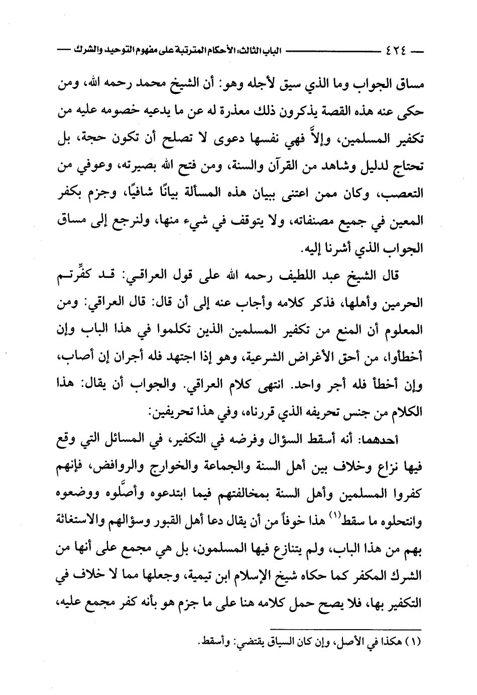 قال الشيخ عبد اللطيف رحمه الله على قول العراقي: قد كفِّرتم الحرمين وأهلها، فذكر كلامه وأجاب عنه إلى أن قال: قال العراقي: ومن المعلوم أن المنع من تكفير المسلمين الذين تكلموا في هذا الباب وإن أخطأوا، من أحق الأغراض الشرعية، وهو إذا اجتهد فله أجران إن اصاب، وإن أخطأ فله أجر واحد. انتهى كلام العراقي. والجواب أن يقال: هذا الكلام من جنس تحريفه الذي قررناه، وفي هذا تحريفين: