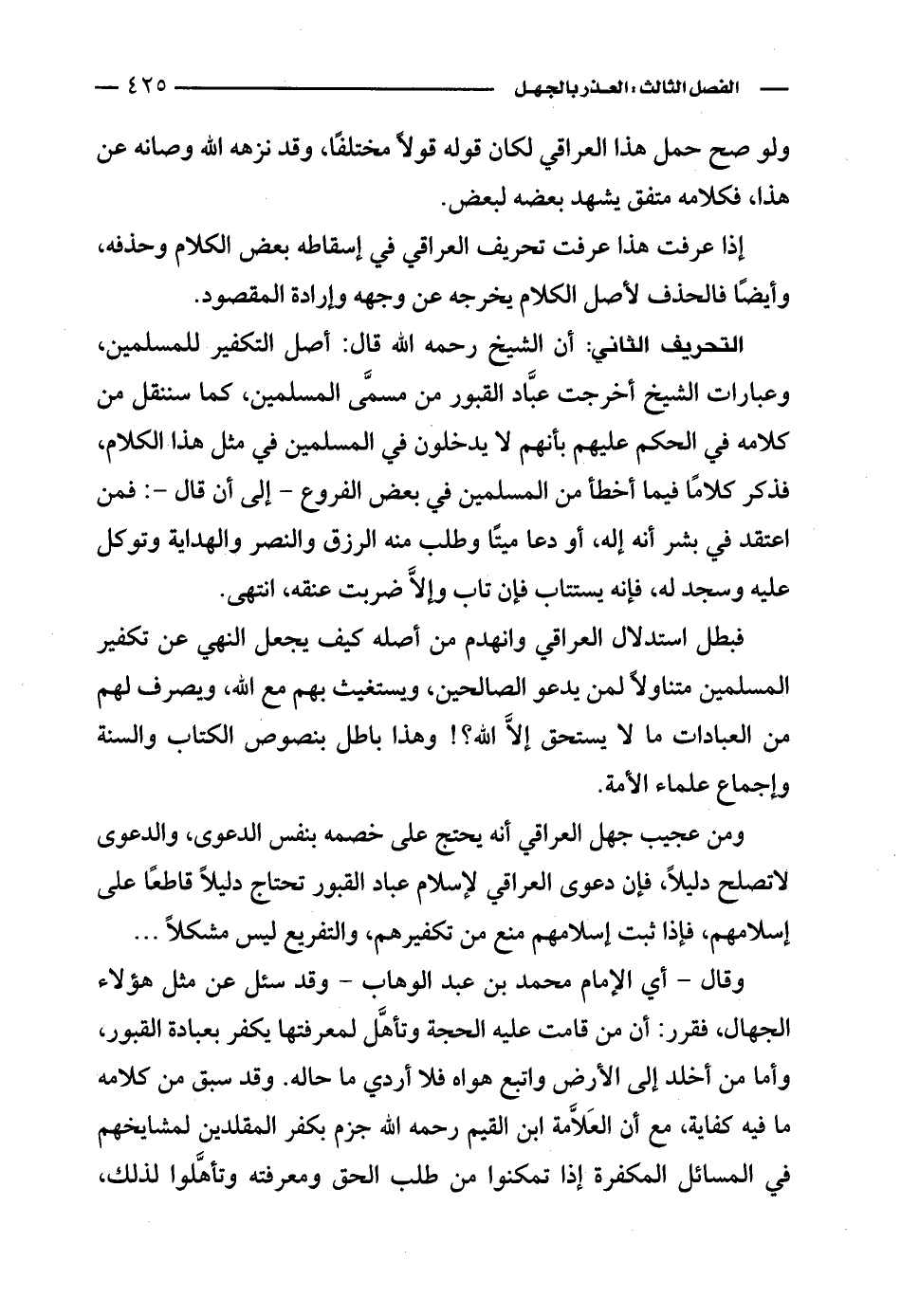 وقال - أي الإمام محمد بن عبد الوهاب - وقد سئل عن مثل هؤلاء الجهال، فقرر: أن من قامت عليه الحجة وتأهَّل لمعرفتها يكفر بعبادة القبور، وأما من أخلد إلى الأرض واتبع هواه فلا أردي ما حاله. وقد سبق من كلامه ما فيه كفاية، مع أن العَلاَّمة ابن القيم رحمه الله جزم بكفر المقلدين لمشايخهم في المسائل المكفرة إذا تمكنوا من طلب الحق ومعرفته وتأهَّلوا لذلك،