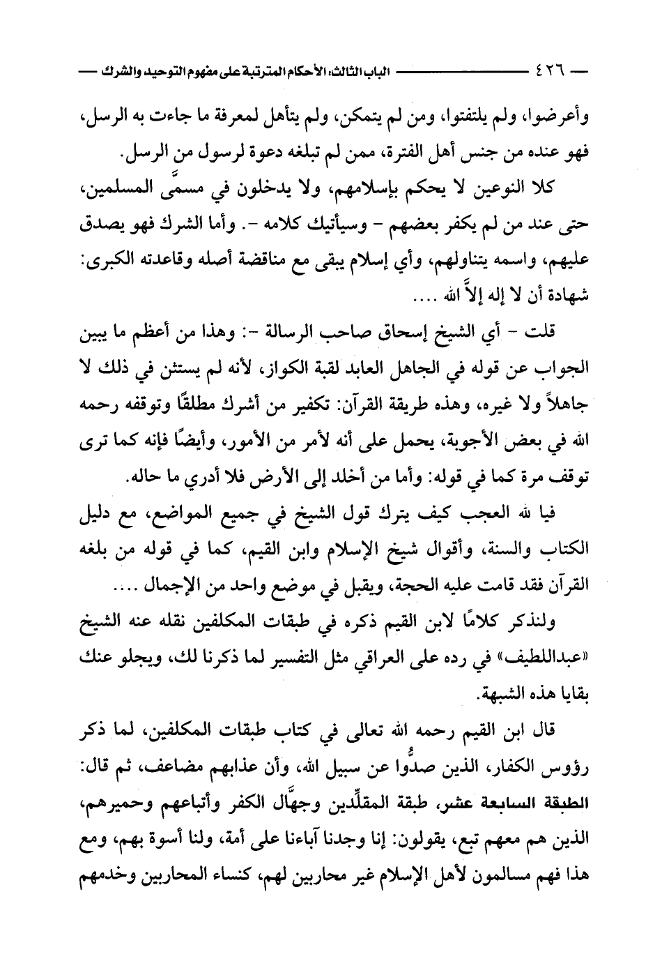 ولنذكر كلامًا لابن القيم ذكره في طبقات المكلفين نقله عنه الشيخ «عبد اللطيف» في رده على العراقي مثل التفسير لما ذكرنا لك، ويجلو عنك بقايا هذه الشبهة.