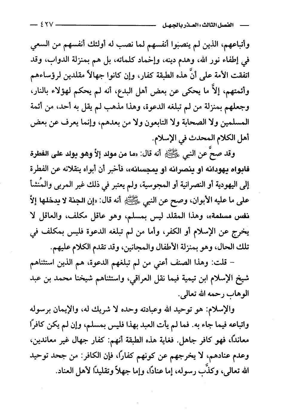 - قلت: وهذا الصنف أعني من لم تبلغهم الدعوة، هم الذين استثناهم شيخ الإسلام ابن تيمية فيما نقل العراقي، واستثناهم شيخنا محمد بن عبد الوهاب رحمه الله تعالى.