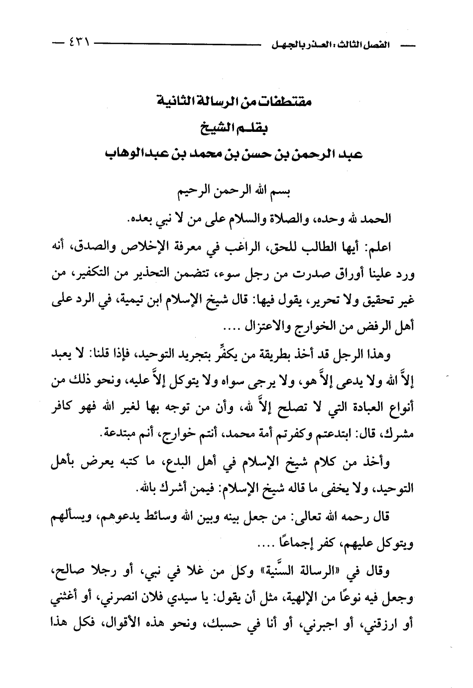 اعلم: أيها الطالب للحق، الراغب في معرفة الإخلاص والصدق، أنه ورد علينا أوراق صدرت من رجل سوء، تتضمن التحذير من التكفير، من غير تحقيق ولا تحرير، يقول فيها: قال شيخ الإسلام ابن تيمية، في الرد على أهل الرفض من الخوارج والاعنزال ....