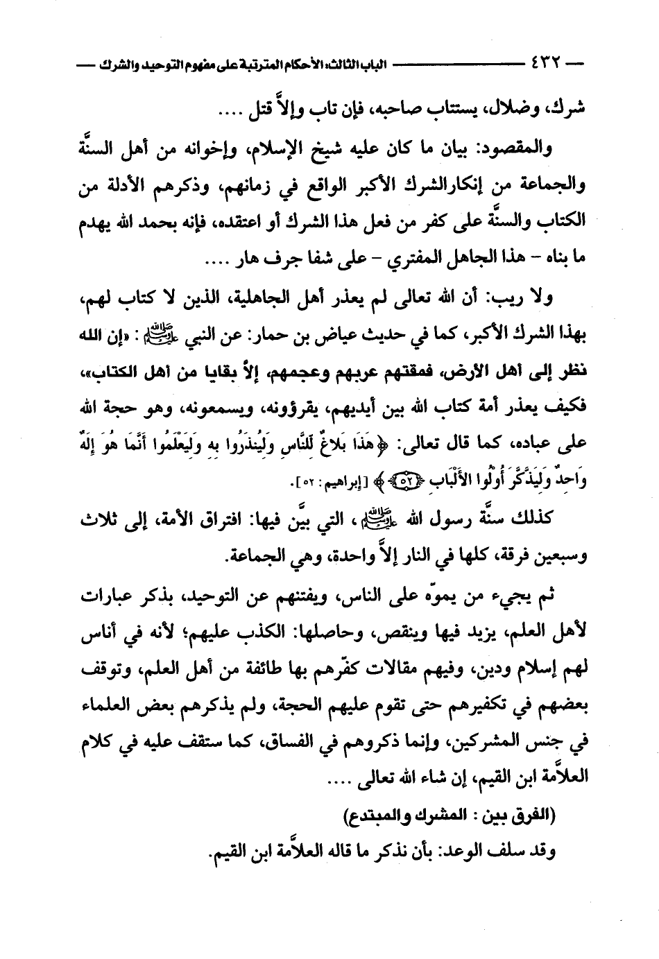 ولا ريب: أن الله تعالى لم يعذر أهل الجاهلية، الذين لا كتاب لهم، بهذا الشرك الأكبر، كما في حديث عياض بن حمار: عن النبي - صلى الله عليه وسلم -: «إن الله نظر إلى أهل الأرض، فمقتهم عربهم وعجمهم، إلاَّ بقايا من أهل الكتاب»، فكيف يعذر أمة كتاب الله بين أيديهم، يقرؤونه، ويسمعونه، وهو حجة الله على عباده، كما قال تعالى: {هَذَا بَلاَغٌ لِّلنَّاسِ وَلِيُنذَرُواْ بِهِ وَلِيَعْلَمُواْ أَنَّمَا هُوَ إِلَهٌ وَاحِدٌ وَلِيَذَّكَّرَ أُوْلُواْ الأَلْبَابِ} [إبراهيم: 52].