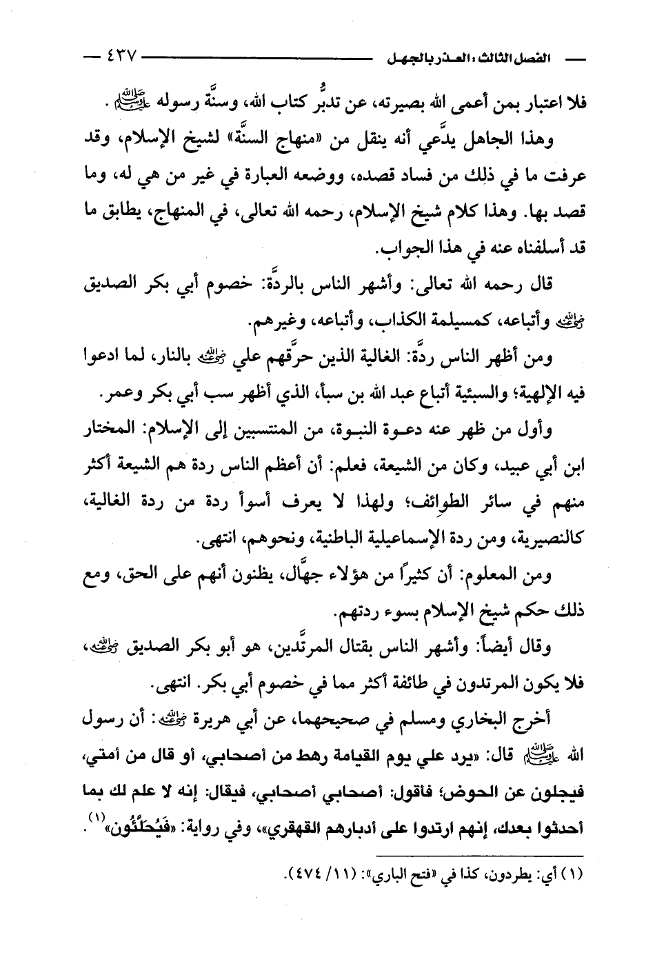 وقال أيضًا: وأشهر الناس بقتال المرتَّدين، هو أبو بكر الصديق - رضي الله عنه -، فلا يكون المرتدون في طائفة أكثر مما في خصوم أبي بكر. انتهى.