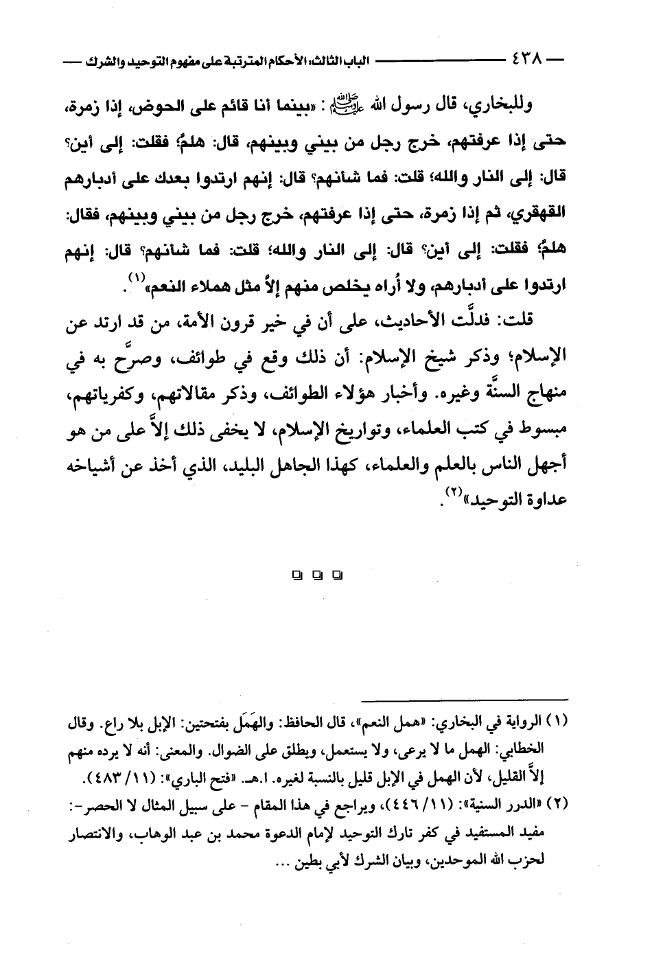 (¬2) «الدرر السنية»: (11/ 446)، ويراجع في هذا المقام - على سبيل المثال لا الحصر ـ: مفيد المستفيد في كفر تارك التوحيد لإمام الدعوة محمد بن عبد الوهاب، والانتصار لحزب الله الموحدين، وبيان الشرك لأبي بطين ...
