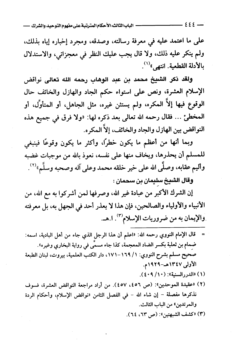 (¬2) «عقيدة الموحدين»: (ص 456، 457). من أراد مراجعة النواقض العشرة، فسوف نذكرها مفصلة - إن شاء الله - في الفصل الثامن «نواقض الإسلام، وأحكام الردة والمرتدين» من الباب الثالث.