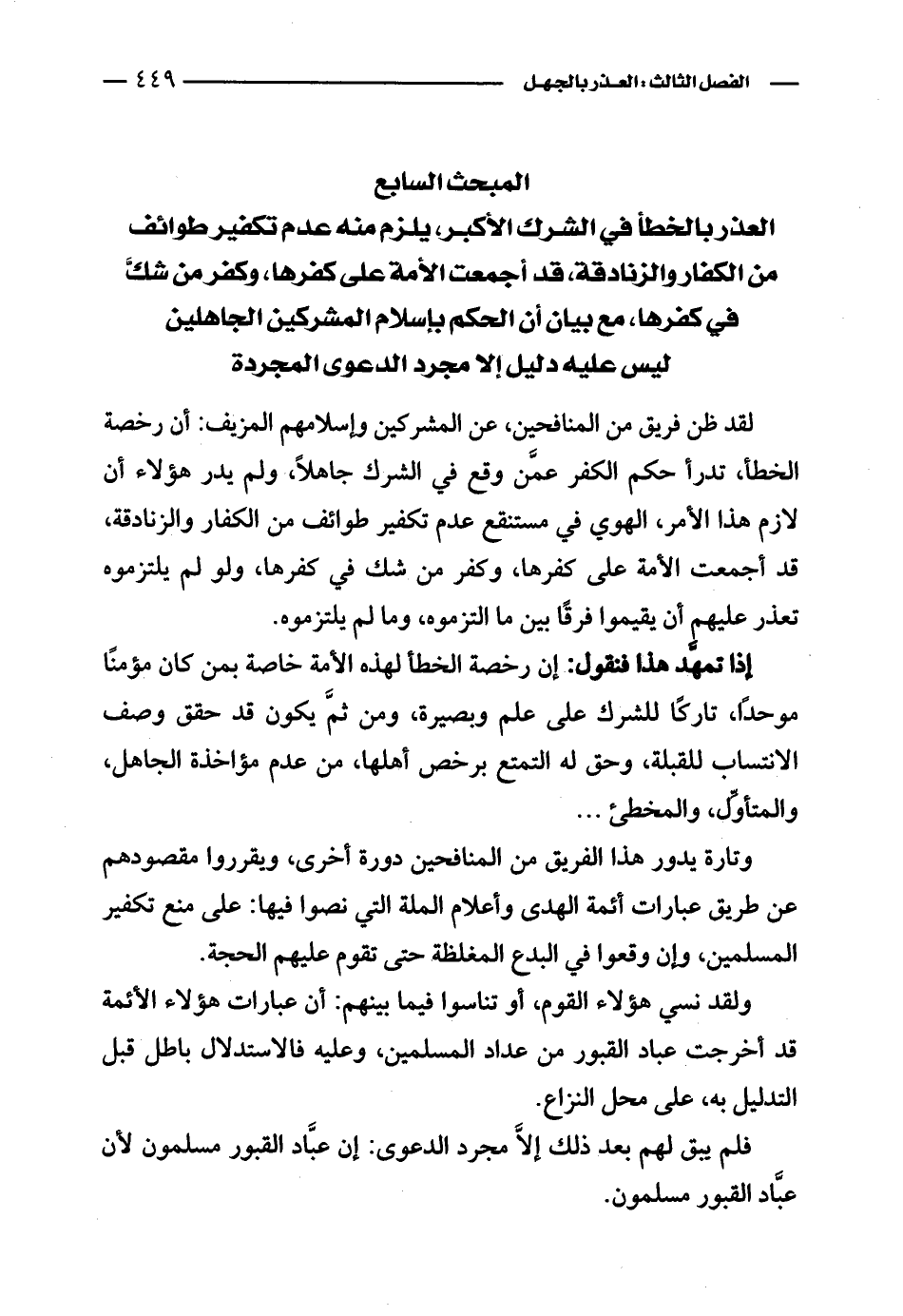 ولقد نسي هؤلاء القوم، أو تناسوا فيما بينهم: أن عبارات هؤلاء الأئمة قد أخرجت عباد القبور من عداد المسلمين، وعليه فالاستدلال باطل قبل التدليل به، على محل النزاع.