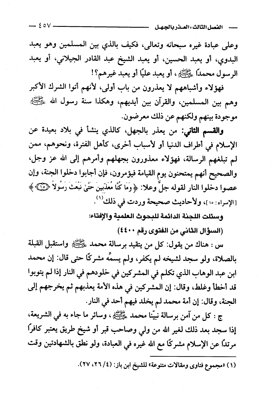 والقسم الثاني: من يعذر بالجهل، كالذي ينشأ في بلاد بعيدة عن الإسلام في أطراف الدنيا أو لأسباب أخرى، كأهل الفترة، ونحوه، ممن لم تبلغهم الرسالة، فهؤلاء معذورون بجهلهم وأمرهم إلى الله عز وجل، والصحيح أنهم يمتحنون يوم القيامة فيؤمرون، فإن أجابوا دخلوا الجنة، وإن عصوا دخلوا النار لقوله جلَّ وعلا: {وَمَا كُنَّا مُعَذِّبِينَ حَتَّى نَبْعَثَ رَسُولاً} [الإسراء: 15]، ولأحاديث صحيحة وردت في ذلك (¬1).