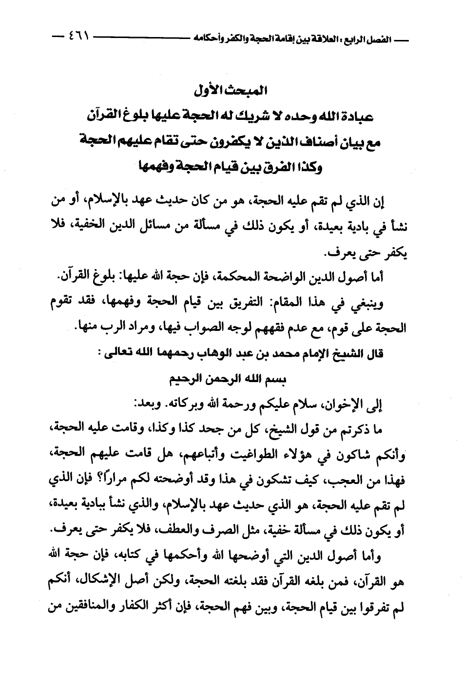 عبادة الله وحده لا شريك له، الحجة عليها بلوغ القرآن مع بيان أصناف الذين لا يكفرون حتى تقام عليهم الحجة وكذا الفرق بين قيام الحجة وفهمها
