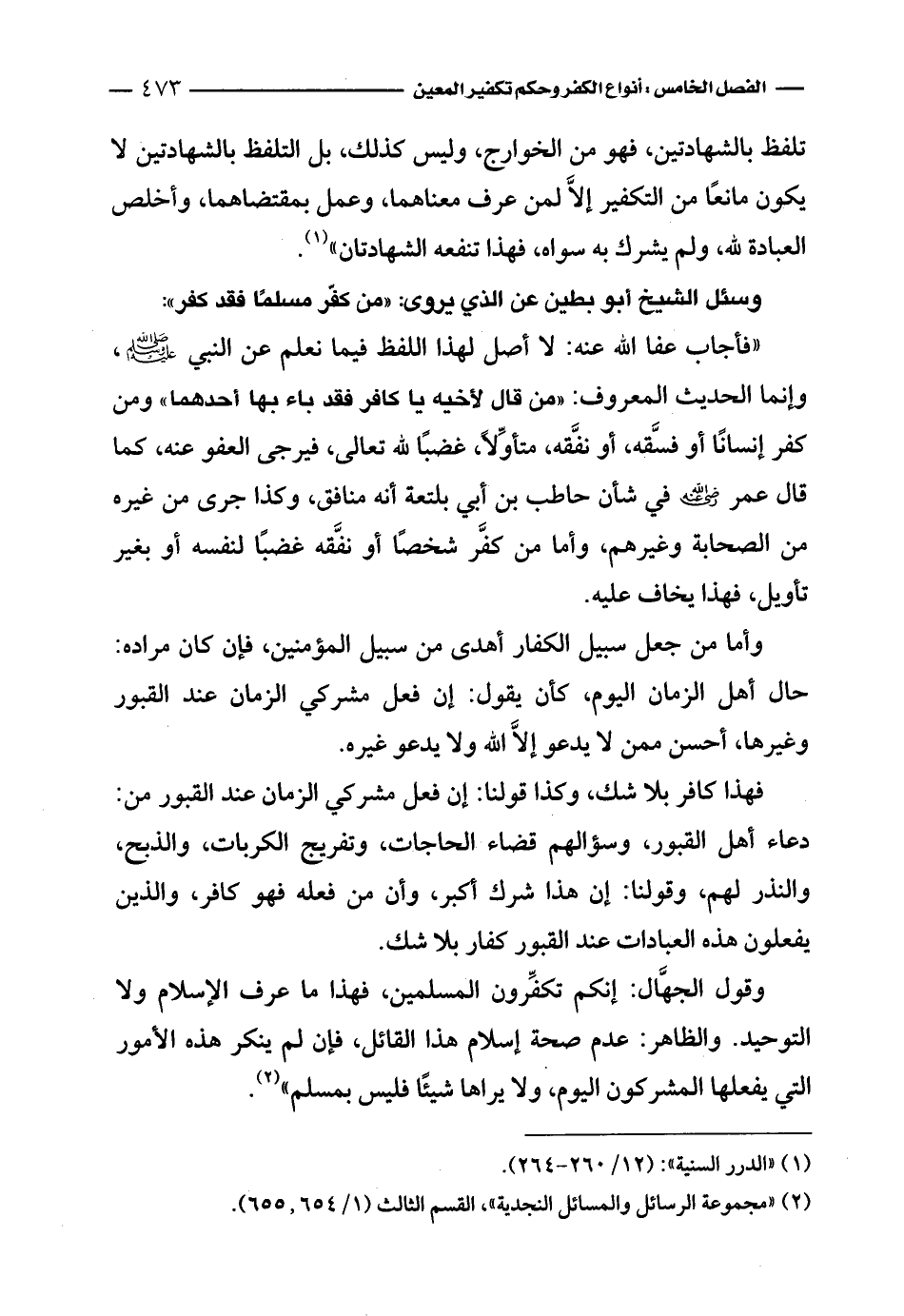 وقول الجهَّال: إنكم تكفِّرون المسلمين، فهذا ما عرف الإسلام ولا التوحيد. والظاهر: عدم صحة إسلام هذا القائل، فإن لم ينكر هذه الأمور التي يفعلها المشركون اليوم، ولا يراها شيئًا فليس بمسلم» (¬2).