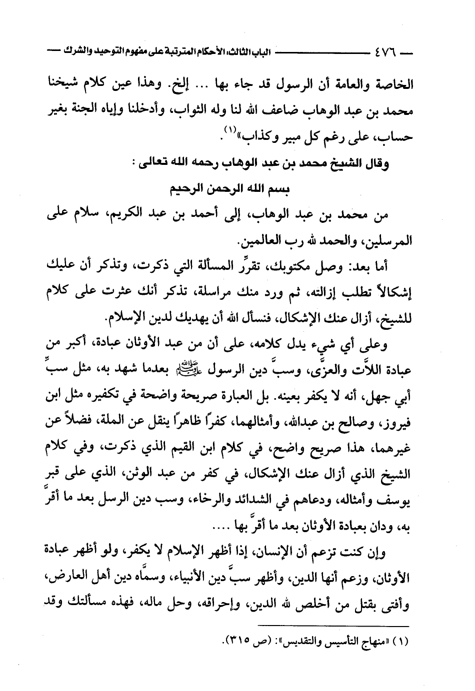 من محمد بن عبد الوهاب، إلى أحمد بن عبد الكريم، سلام على المرسلين، والحمد لله رب العالمين.
