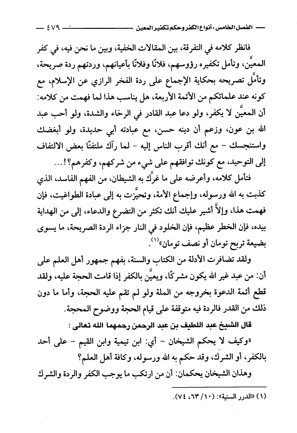 فانظر كلامه في التفرقة، بين المقالات الخفية، وبين ما نحن فيه، في كفر المعيَّن، وتأمل تكفيره رءوسهم، فلانًا وفلانًا بأعيانهم، وردتهم ردة صريحة وتأمَّل تصريحه بحكاية الإجماع على ردة الفخر الرازي عن الإسلام، مع كونه عند علمائكم من الأئمة الأربعة، هل يناسب هذا لما فهمت من كلامه: أن المعيَّن لا يكفر، ولا دعا عبد القادر في الرخاء والشدة، ولو أحب عبد الله بن عون، وزعم أن دينه حسن، مع عبادته أبي حديدة، ولو أبغضك واستنجسك - مع أنك أقرب الناس إليه - لما رآك ملتفتًا بعض الالتفات إلى التوحيد، مع كونك توافقهم على شيء من شرطهم، وكفرهم؟! ...